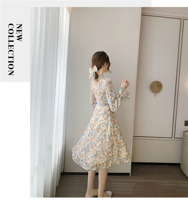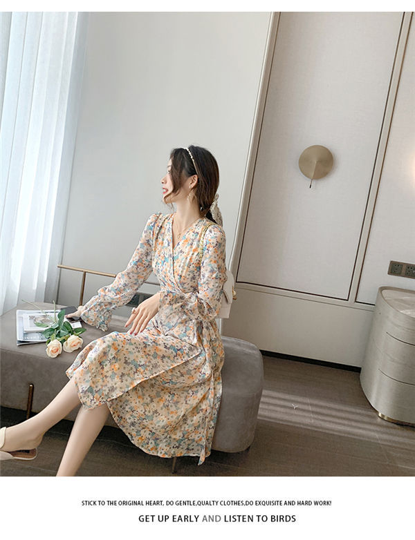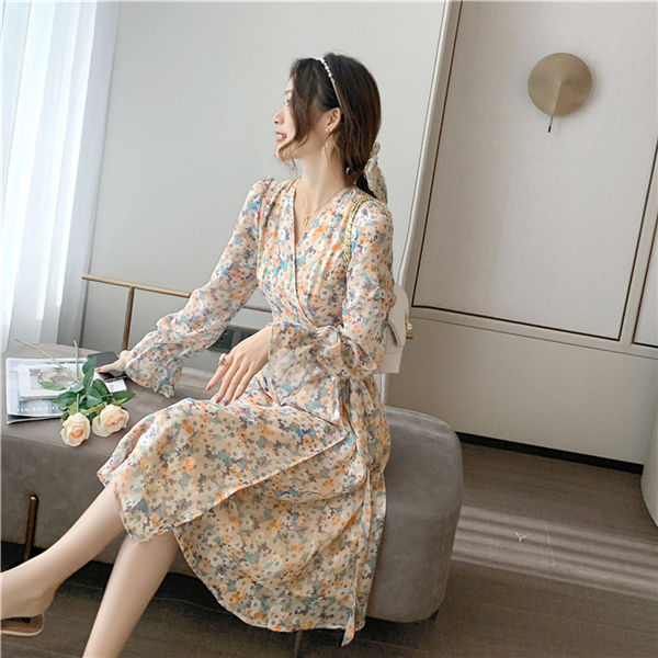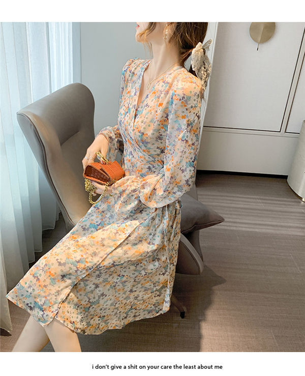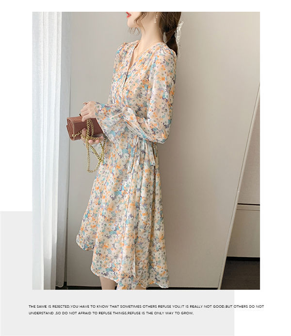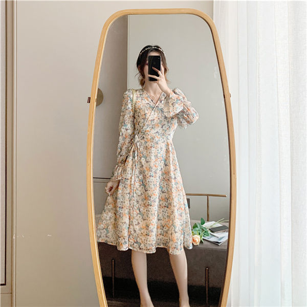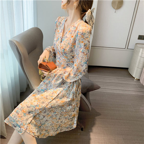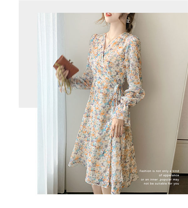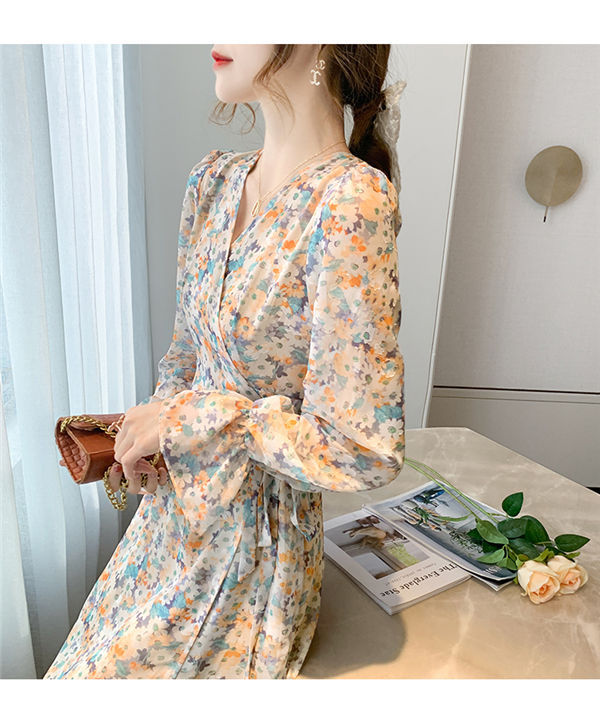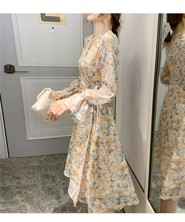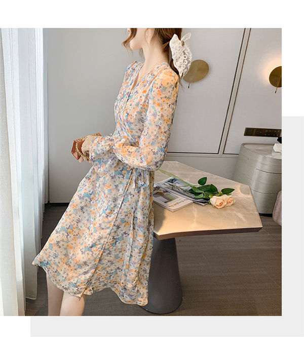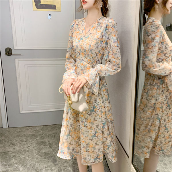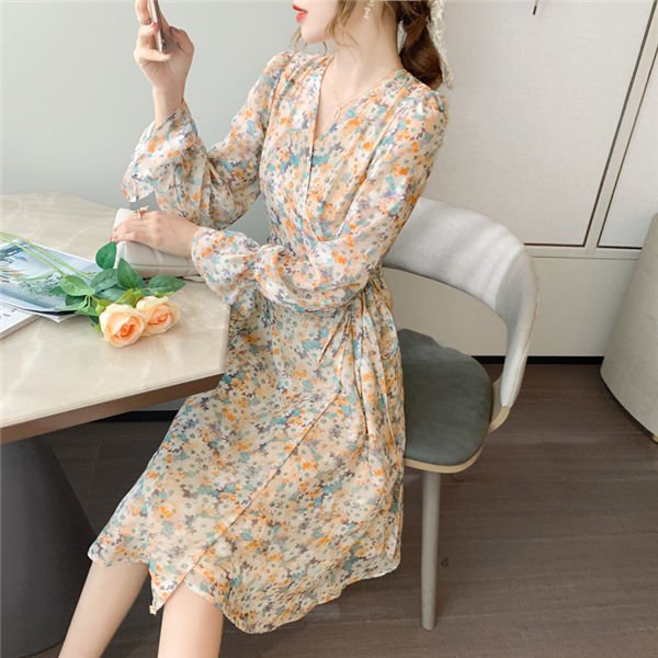 ワンピース レディース 長袖 ワンピース 花柄 Vネック ひざ丈ワンピ シフォンワンピ 可愛い オシャレ長袖 総柄ワンピース 秋物