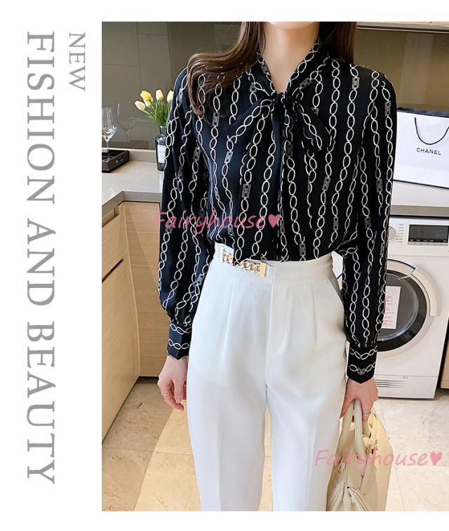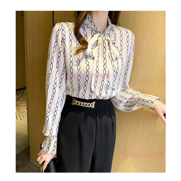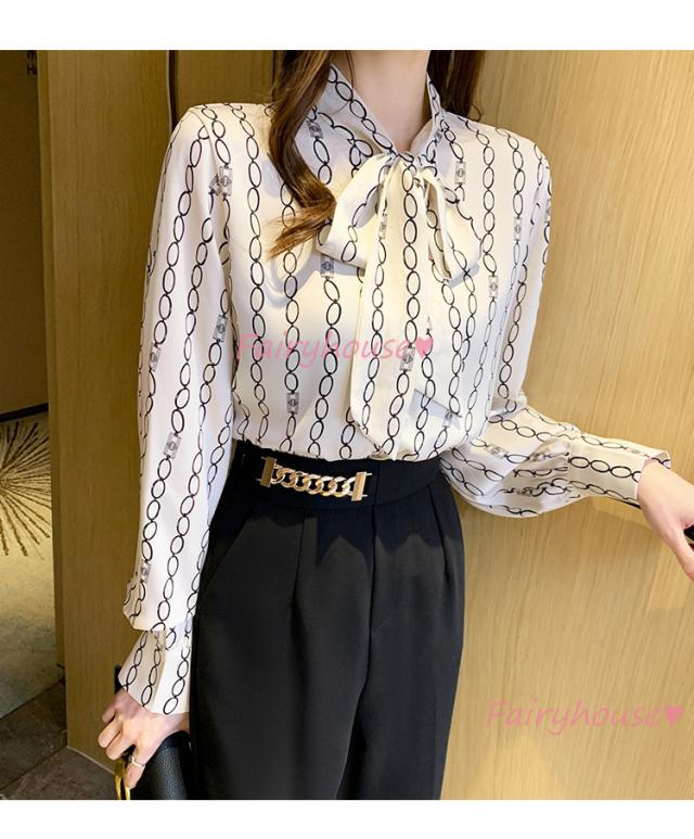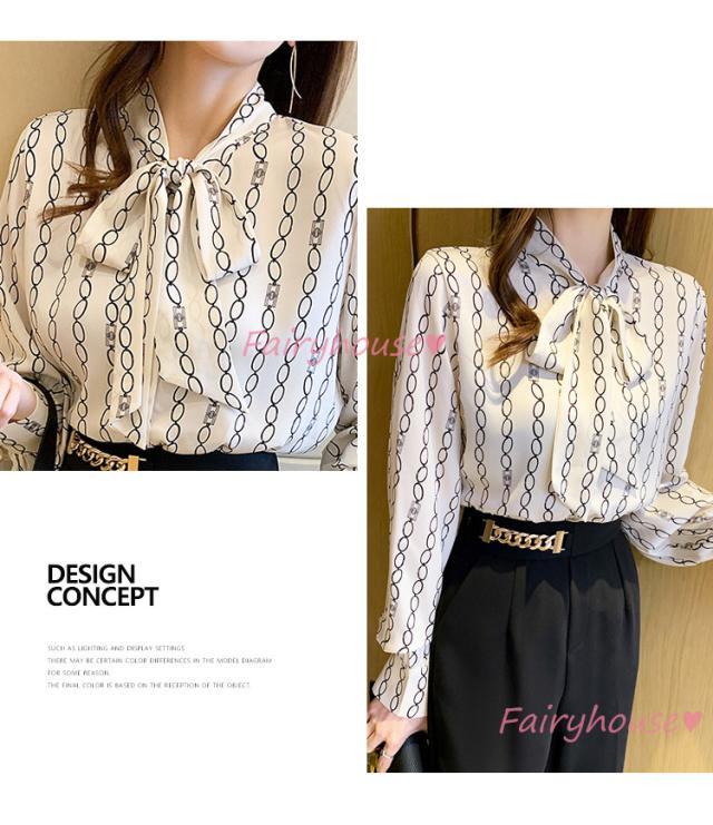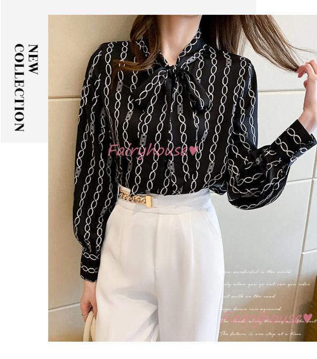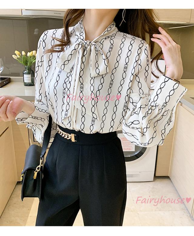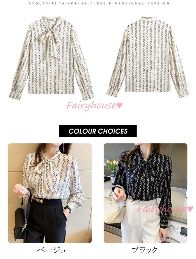 ブラウス レディース 長袖ブラウス 秋服 オフィスブラウス リボンネック オシャレブラウス プリントトップス 韓国風 大人 上品 通勤OL ゆったりシャツ40代