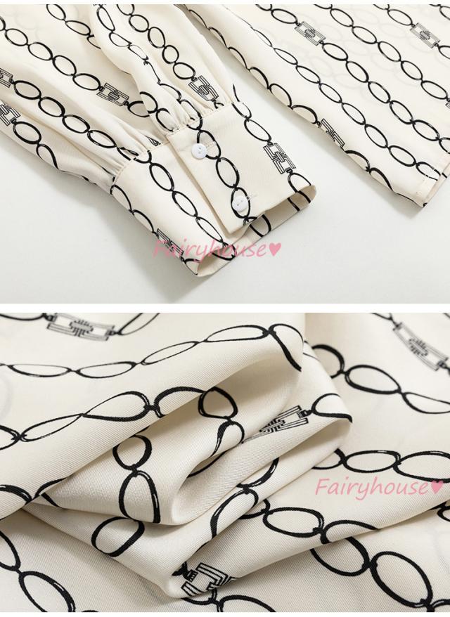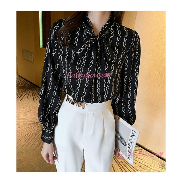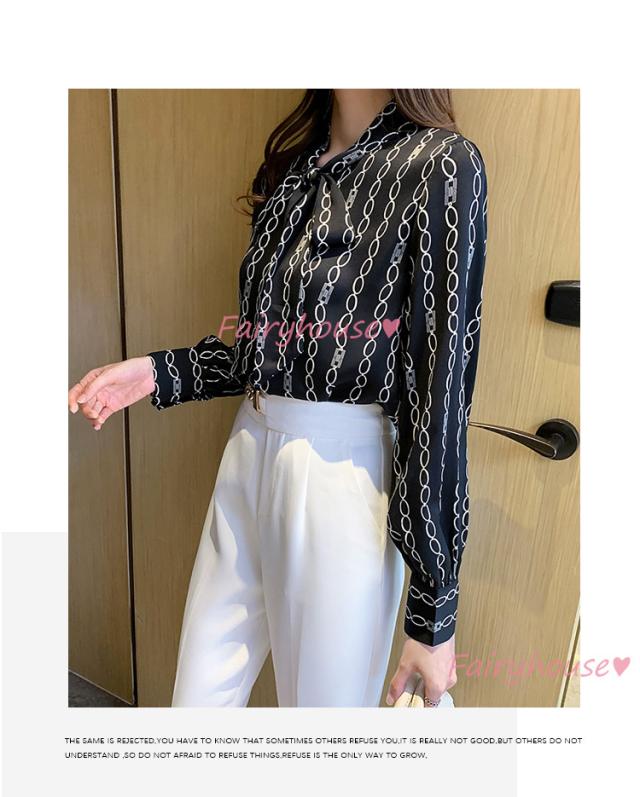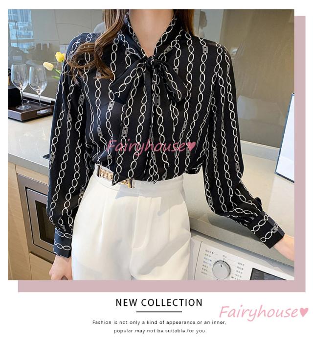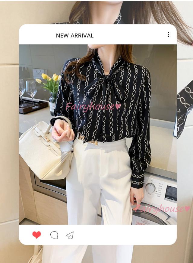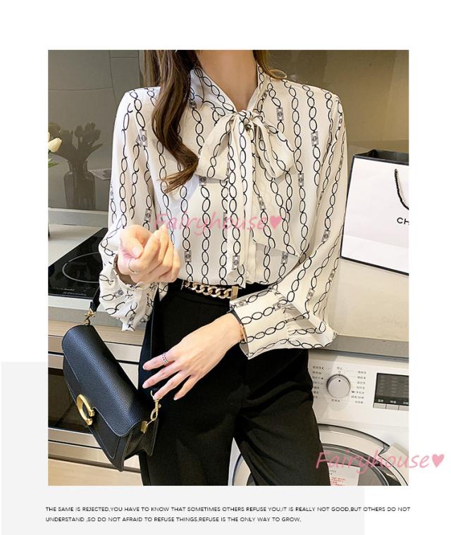 ブラウス レディース 長袖ブラウス 秋服 オフィスブラウス リボンネック オシャレブラウス プリントトップス 韓国風 大人 上品 通勤OL ゆったりシャツ40代