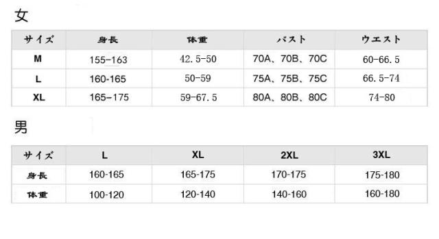 | サイズ | 女M 女L 女XL 男L 男XL 男2XL 男3XL |