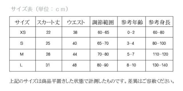 | サイズについての説明 | サイズ: XS スカート丈22 ウエスト38 調節範囲60-65 参考年齢0-2歳 参考身長60-80cm S スカート丈25 ウエスト40 調節範囲65-70 参考年齢3-4歳 参考身長80-100cm M スカート丈28 ウエスト44 調節範囲70-80 参考年齢5-7歳 参考身長110-120cm L スカート丈31 ウエスト48 調節範囲80-90 参考年齢8-10歳 参考身長130-140cm |