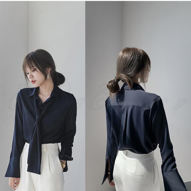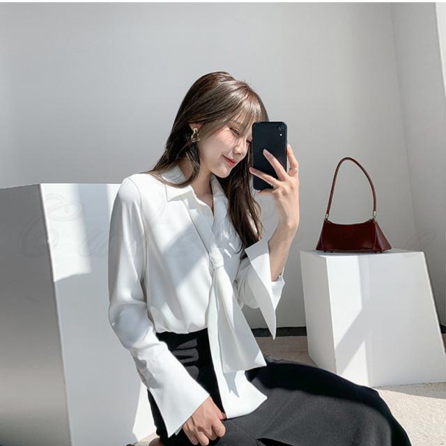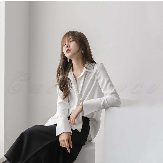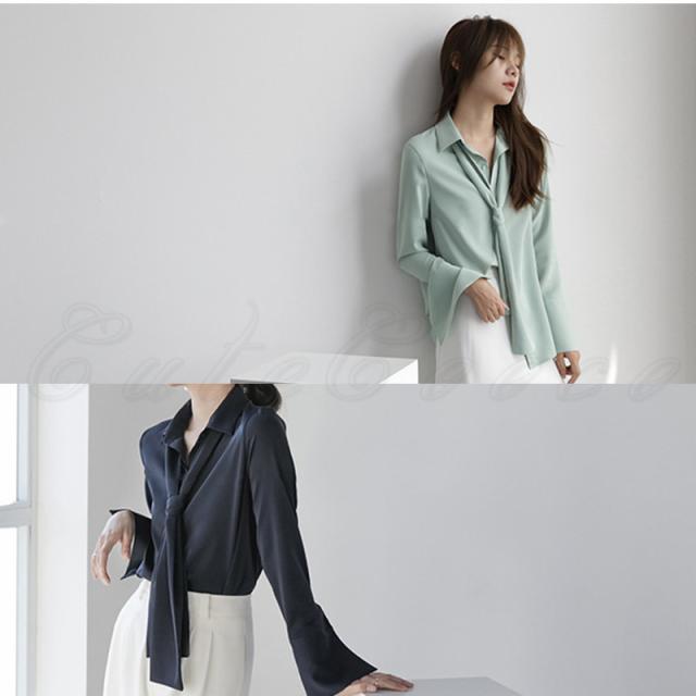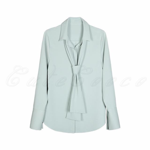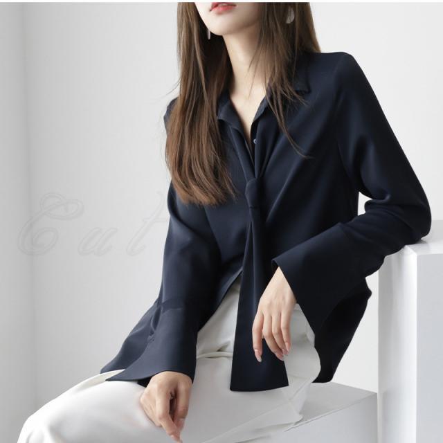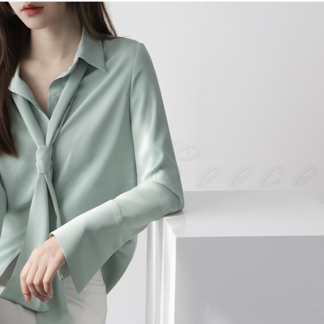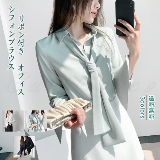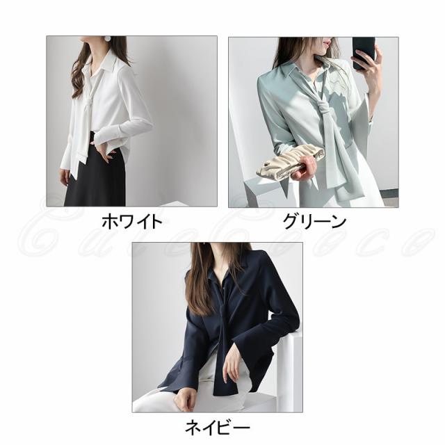 シフォンブラウス レディース 開襟シャツ 無地 ポロ襟 長袖 リボン付き トップス カジュアル ゆったり オフィス 21年秋新作 きれいめ おしゃれ 春秋