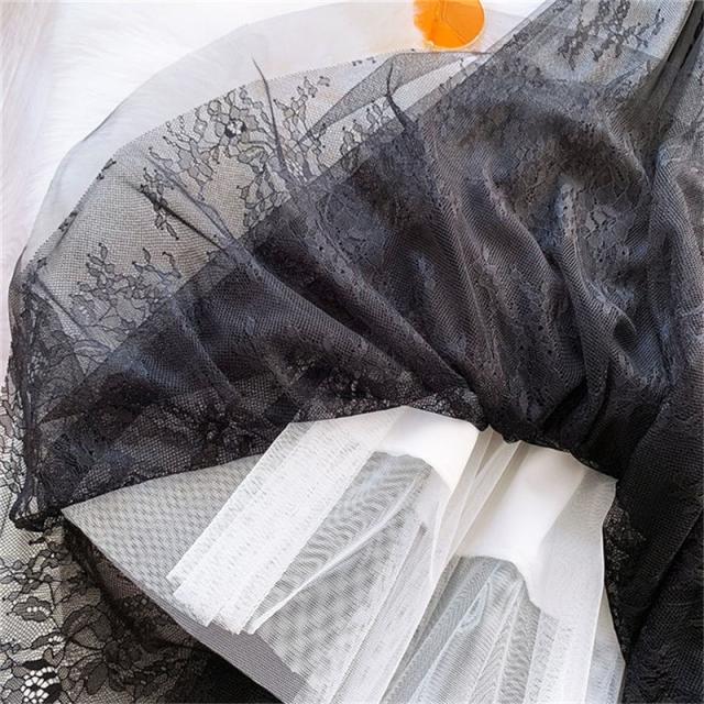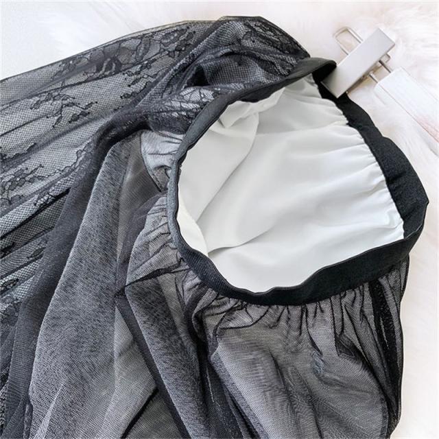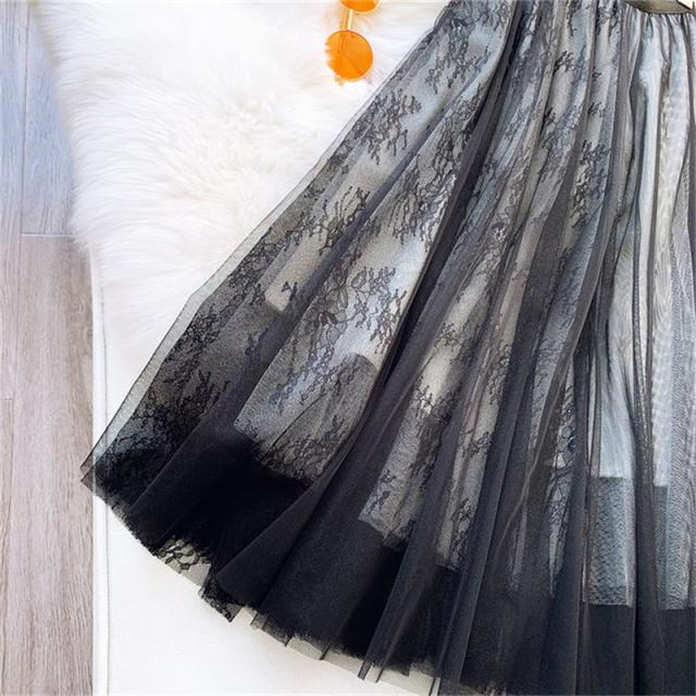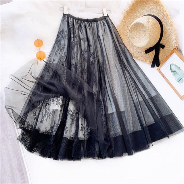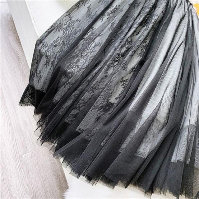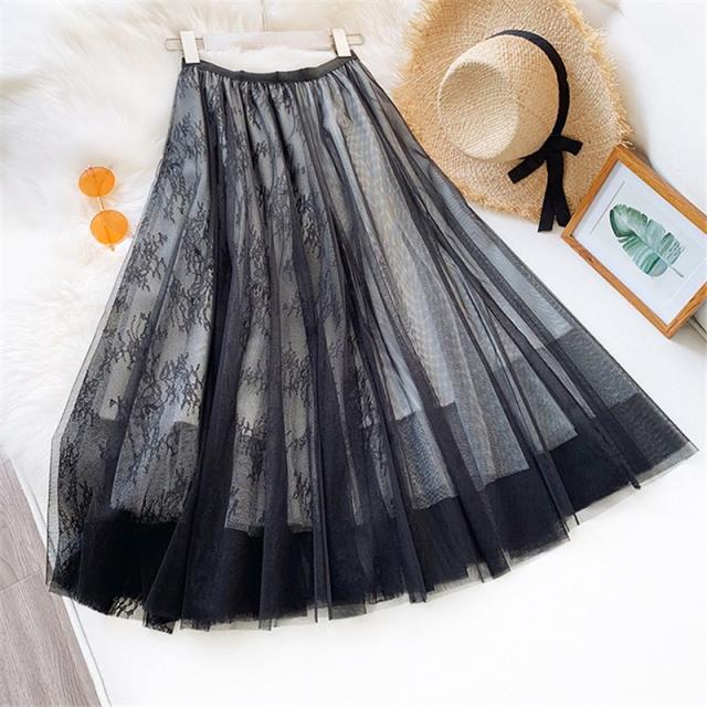 スカート レディース 秋冬 ボトムス チュールスカート チュール フレアスカート フレア レーススカート ボリューム ロングスカート 黒 ブラック ウエストゴム