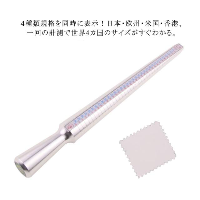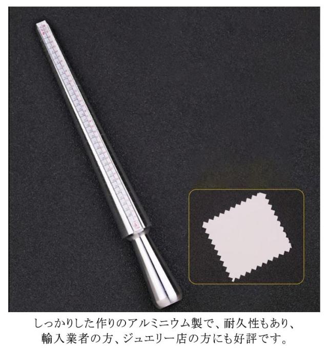 | 4種類規格を同時に表示!日本・欧州・米国・香港、一回の計測で世界4カ国のサイズがすぐわかる。 プレゼント等で相手のサイズを知りたい、自分の指のサイズが分からない、サイズが合っているかどうか心配な方。 この棒にリングを挿すと、そのリングが何号かが分かります。ネットや通販で良くお買い物をするかたには特にお勧めです。 表示は4種類で、日本、アメリカ、ヨーロッパ、香港のリングサイズが、一度に計測できます。 しっかりした作りのアルミニウム製で、耐久性もあり、輸入業者の方、ジュエリー店の方にも好評です。 海外旅行に行く時や、海外のウェブサイトでリングを購入する時など、お持ちのリングが海外では何号なのかが分かり、とても便利です。 | |