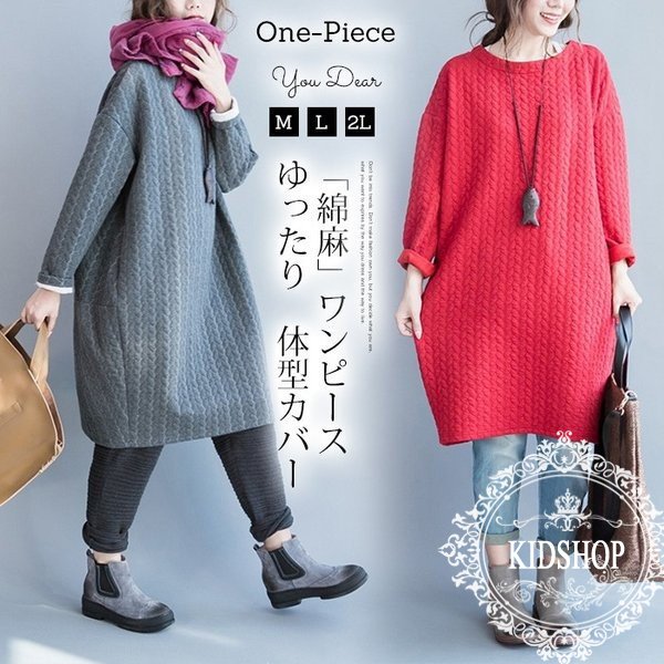 ワンピース チュニック レディース トップス 綿 コットン Aライン 長袖 無地 秋ワンピース 体型カバー チュニックワンピース ゆったり 大きいサイズ