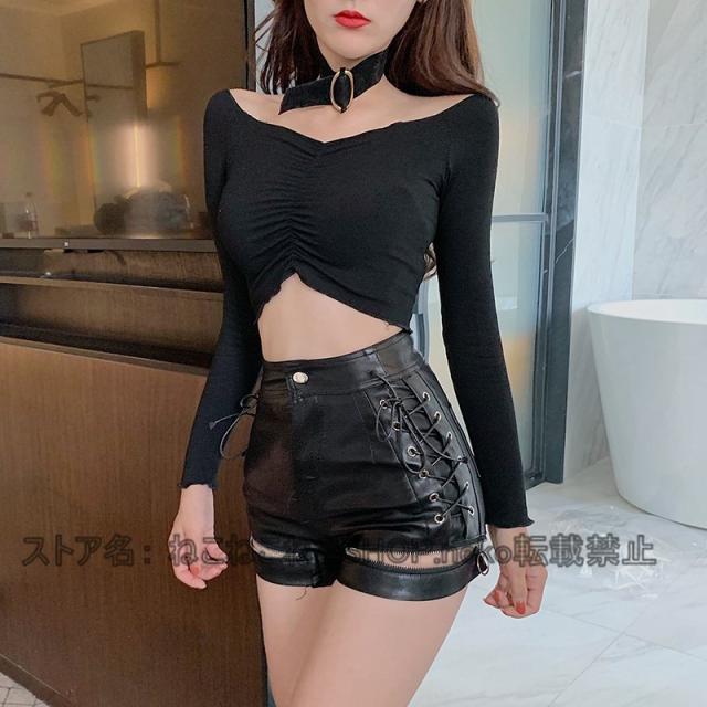 レザーパンツ フェイクレザー PU革 短パン レディースハイウエスト欧米風 サイド編み上げ ミニ丈 ダンスHIPHOP衣装ファスナー付き細身おしゃれ美尻