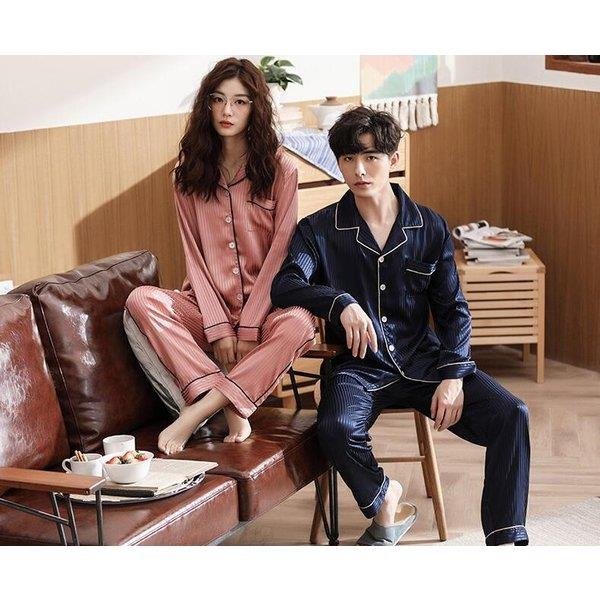 ご夫婦 お揃い パジャマ ペアルック カップル セットアップ ストライプ柄 長袖 Tシャツ*パンツ さわやか かわいい トップス 夏 ペア プレゼント 部屋着 寝巻き