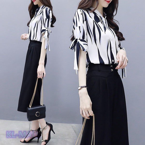 セットアップ レディース 夏 KL シャツ ストライプ シフォン ガウチョパンツ カジュアル 2点セット 韓国風 ボトムス 通勤 OL