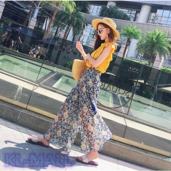 セットアップ ボヘミア風 トップス KL ノースリーブ パンツ セットレディース 花柄 シフォン ワイド 九分丈 ガウチョパンツ ハ