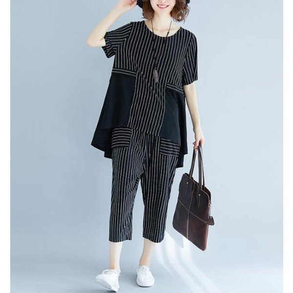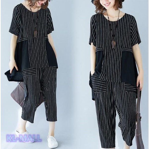 セットアップ 森ガール サルエル KL パンツ 七分丈 ストライプ 半袖 ブラウス 上下セット ゆったり カジュアル 体型カバー