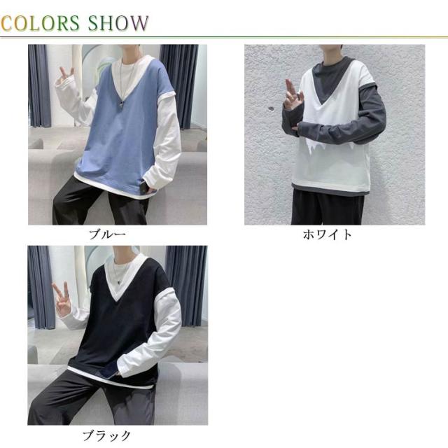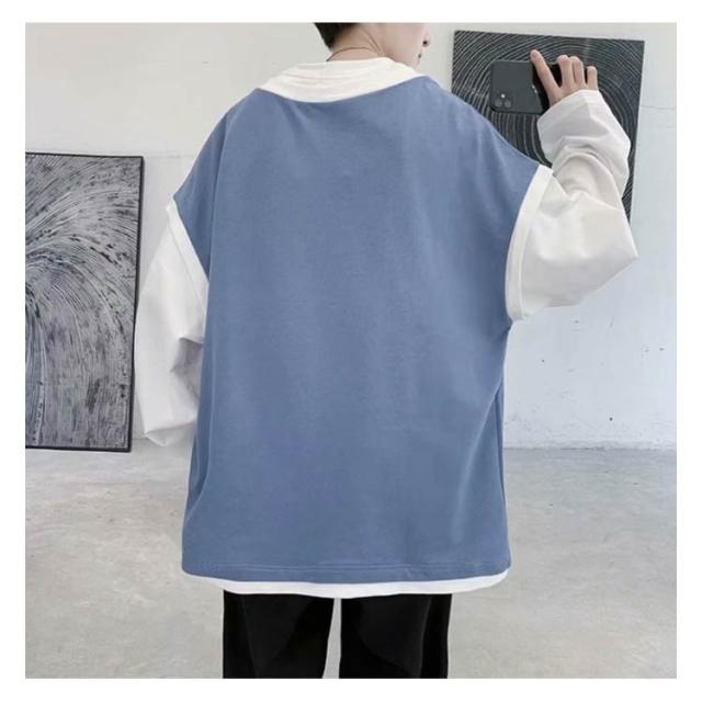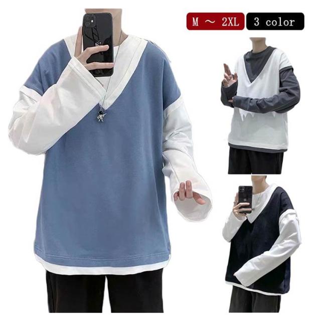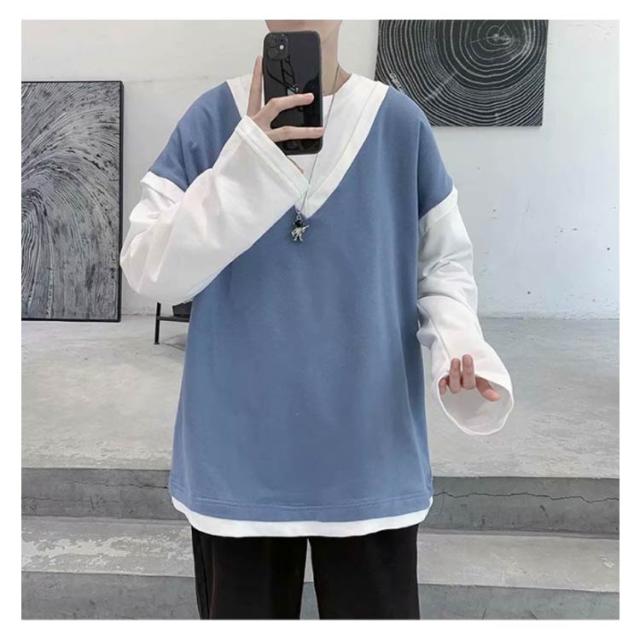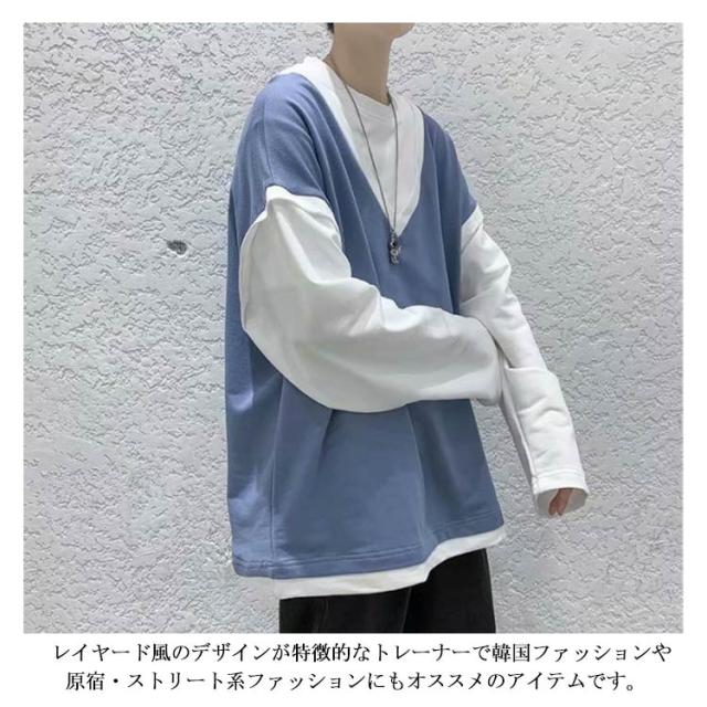 トレーナー メンズ 韓国 原宿 ストリート オルチャン 無地 重ね着 オーバーサイズ ビックシルエット ゆったり レディース ファッション 古着 ストリート系 カジュアル 古着 トレーナー 大きめ 切り替え vネック グルネック
