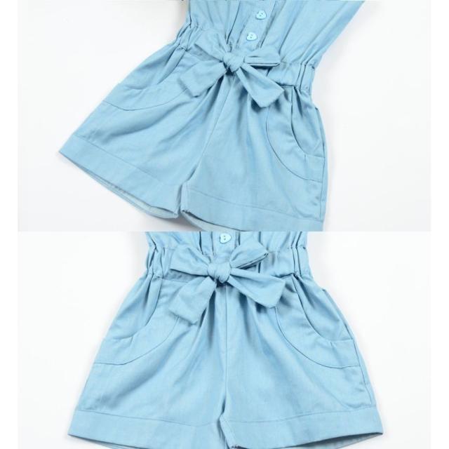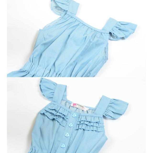 子ども用 サロペット キッズ 子ども服 ノースリーブ フリルスリーブ 膝上 夏 女の子 ウエストリボン 可愛い オシャレ デニム風 カジュアル お出掛