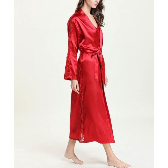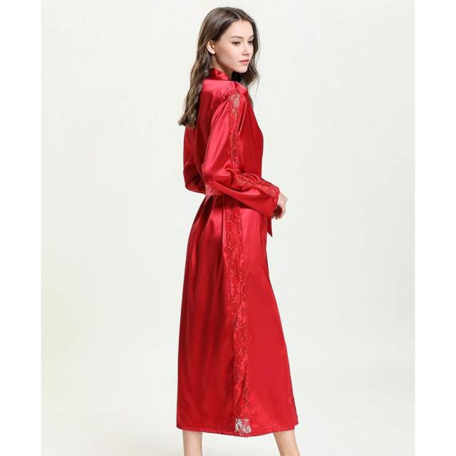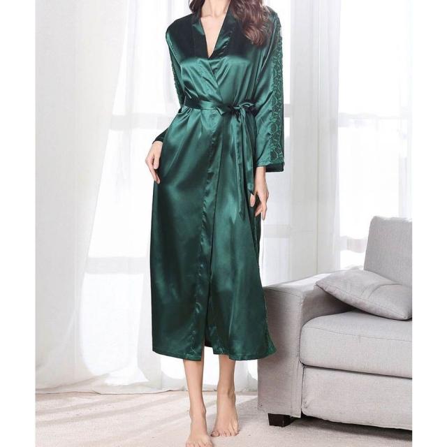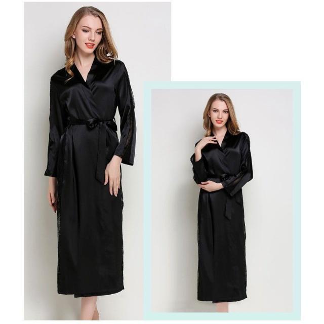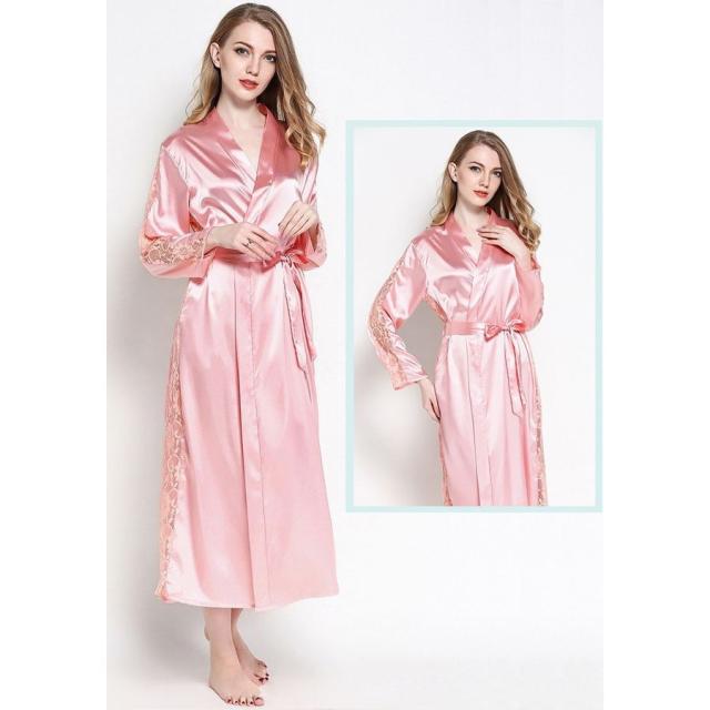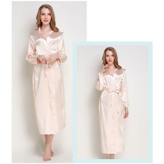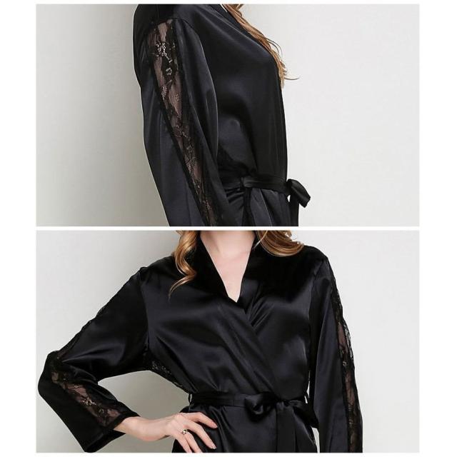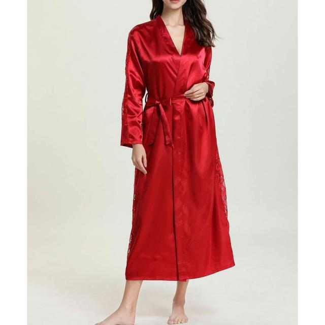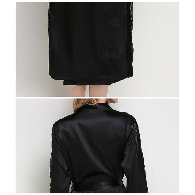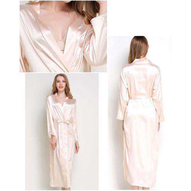 ナイトガウン 長袖 ロング丈 サテン調 レース レディース ローブ 羽織り シースルー 透かしデザイン ルームウエア 部屋着 おしゃれ シンプル 無地