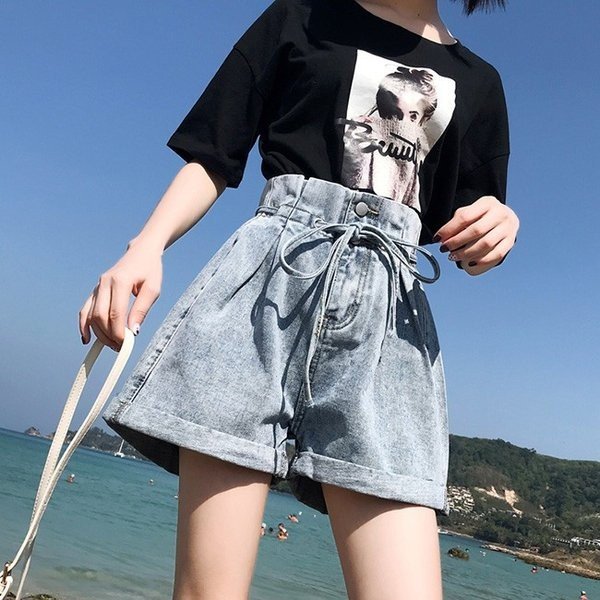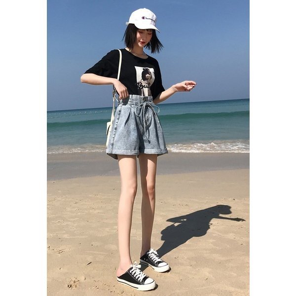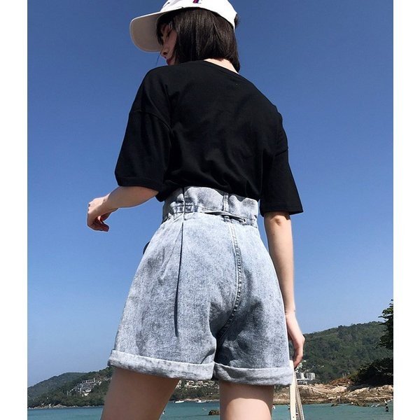 ショートパンツ レディース デニム KL ハイウエスト リボン タック入り 裾ロールアップ ワイド ゆったり 夏新作 ジーンズ デニム