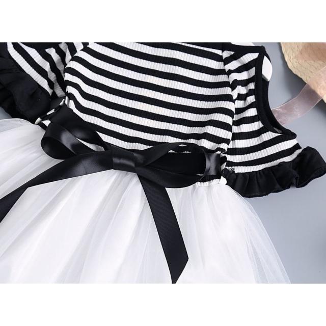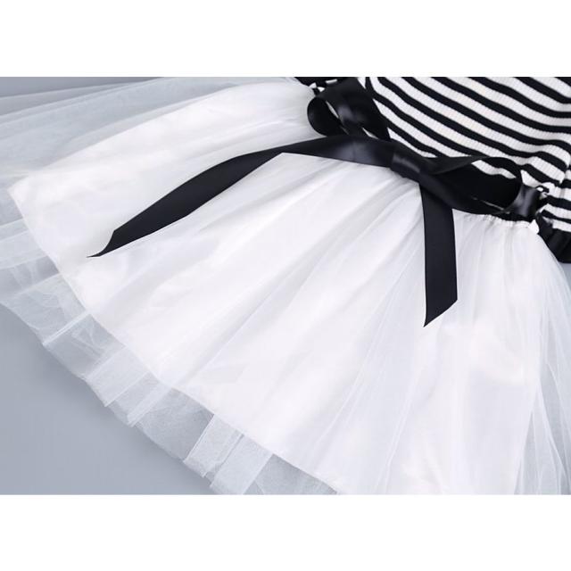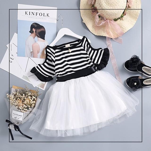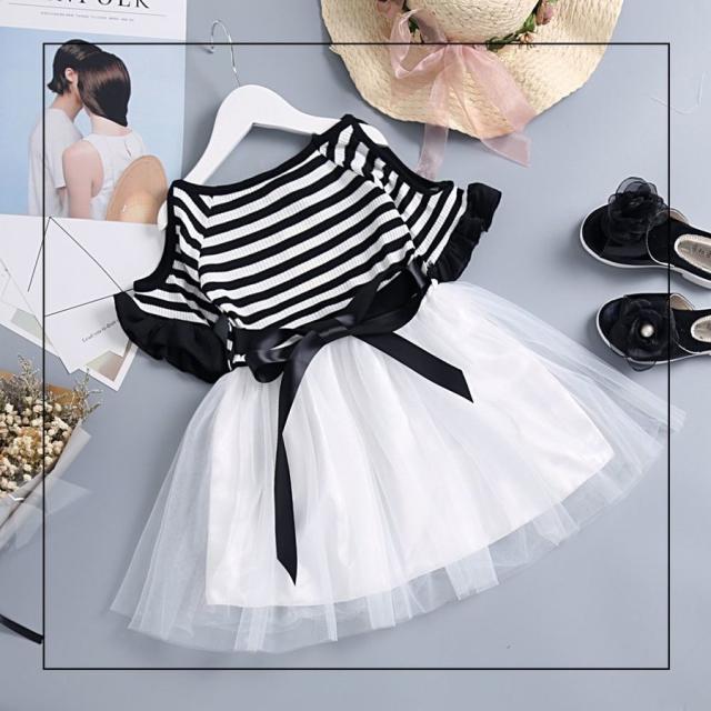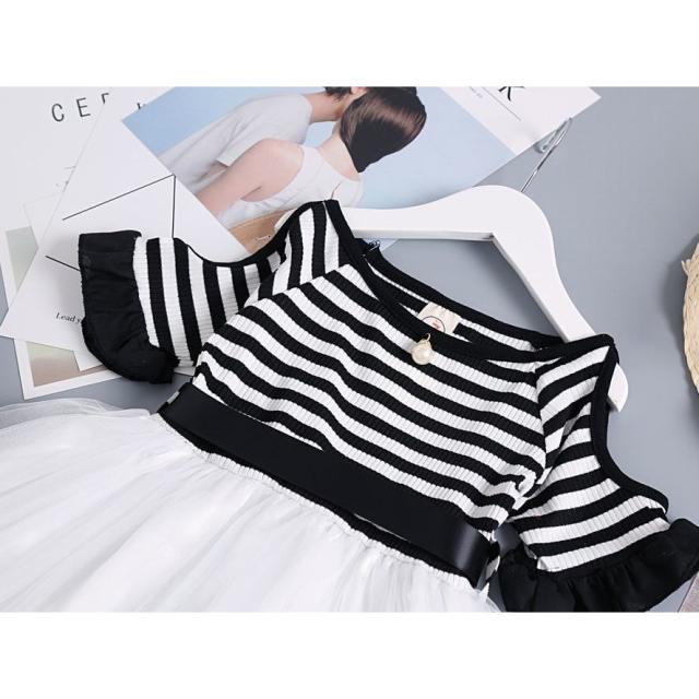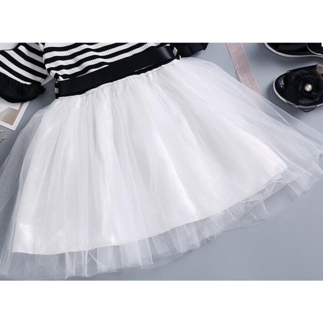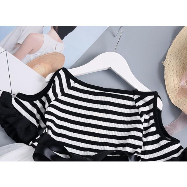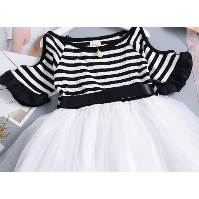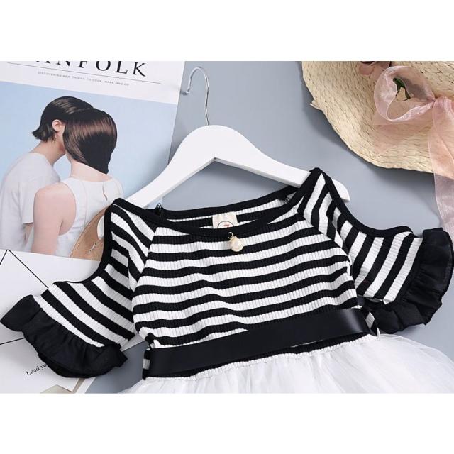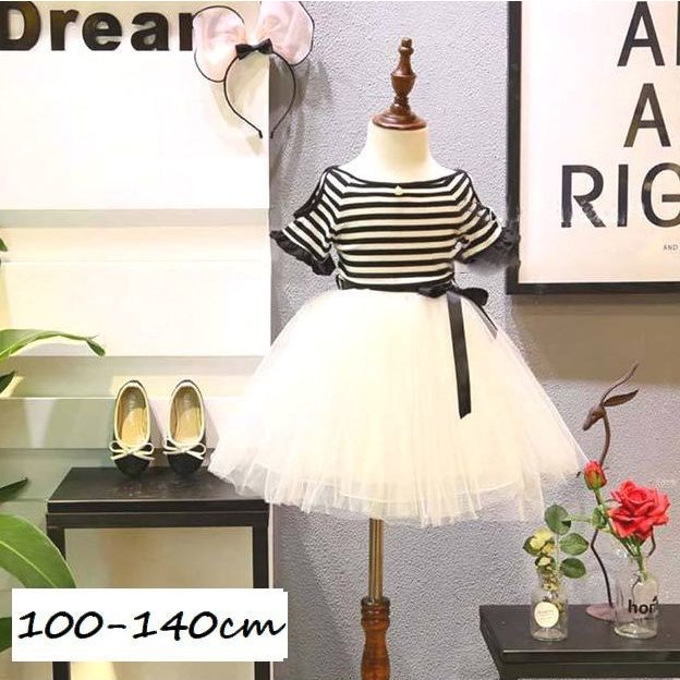 半袖ワンピース 子供服 キッズ ジュニア 肩開き 袖口フリル ボートネック ボーダー チュールレース メッシュ おしゃれ