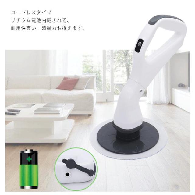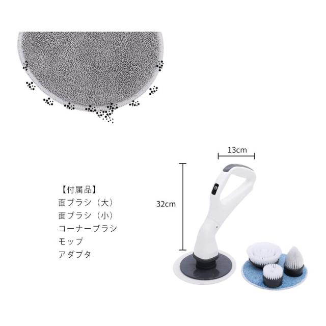| (仕様) サイズ:32*13cm(本体) 重量:約370g(本体) 材質:ABS 電源:充電式 内臓充電池:リチウムイオン電池 2500mAh 充電時稼働時間:約3〜4時間充電(満充電)で約60分稼働 ※時間は使用環境や使用期間によって異なりますのでご注意ください。 (付属品) 面ブラシ(大) 面ブラシ(小) コーナーブラシ モップ アダプタ | |