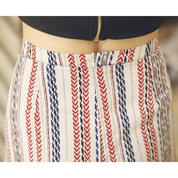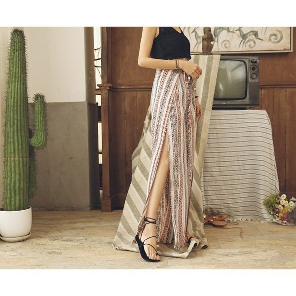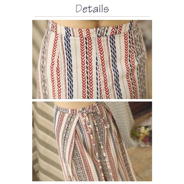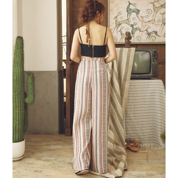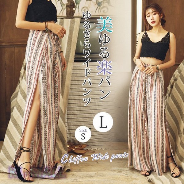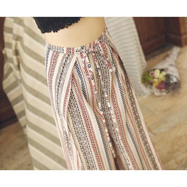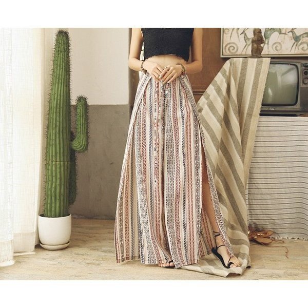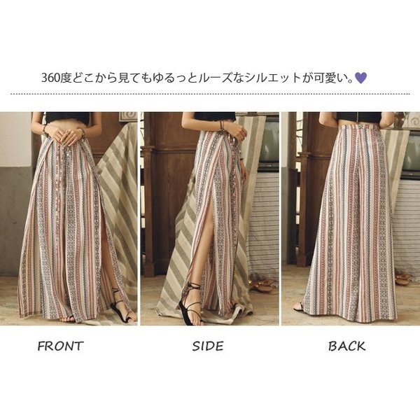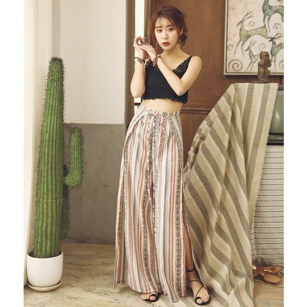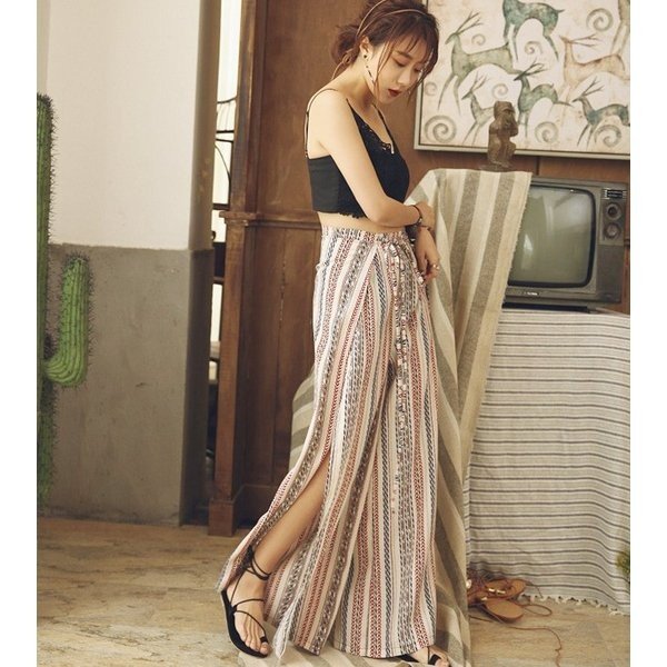 \今旬トレンド/水着の上に履く KL ガウチョパンツ エスニック柄 ストライプ ハワイアン スリット ロング ハイウエスト レディース