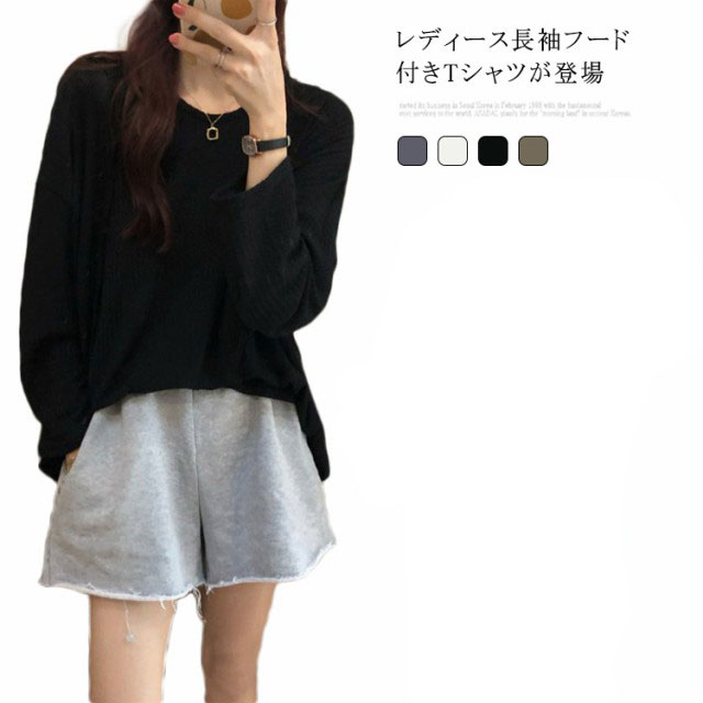 Tシャツ 長袖 フード付き レディース パーカー 薄手 春秋 長袖Tシャツ ゆったり ドロップショルダー フード付きTシャツ オーバーサイズ トップス カジュアル 重ね着 おしゃれ 送料無料