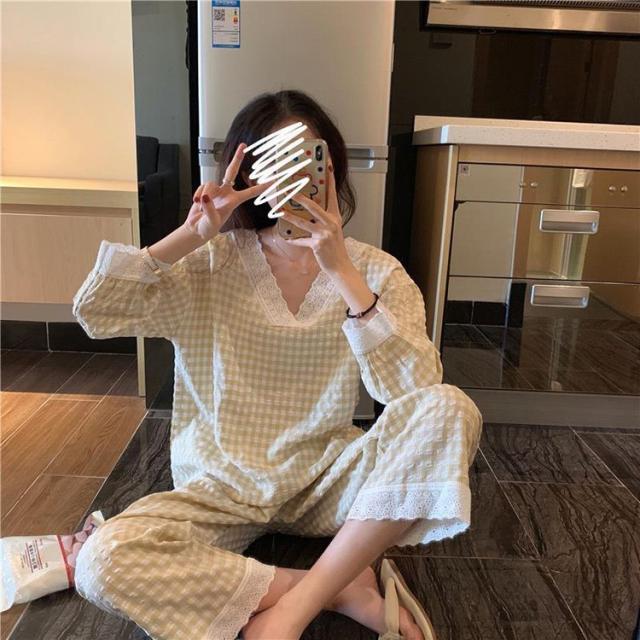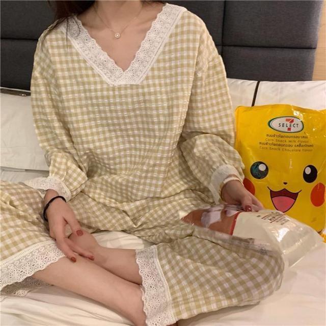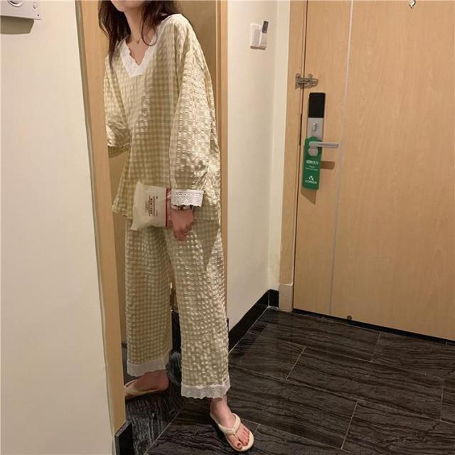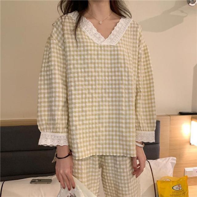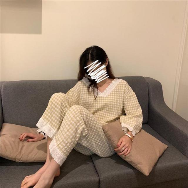 パジャマ レディース ルームウェア 秋冬 綿 セットアップ レース 長袖 上下セット チェック柄 可愛い ロングパンツ ゆったり 韓国風 寝巻き 部屋着 寝間着
