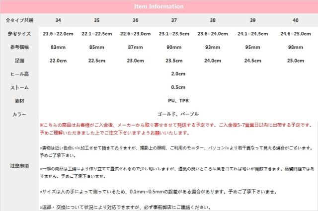 | サイズについての説明 | (カラー):ゴールド、パープル 参考サイズ 21.6~22.0cm 22.1~22.5cm 22.6~23.0cm 23.1~23.5cm 23.6~24.0cm 24.1~24.5cm 24.6~25.0cm 参考横幅 83mm 85mm 87mm 90mm 93mm 95mm 98mm 足囲 22.0cm 22.5cm 23.0cm 23.5cm 24.0cm 24.5cm 25.0cm ヒール高 3.0cm ストーム 0.5cm ◆サイズ詳細等の測り方はスタッフ間で統一、徹底はしておりますが、若干の誤差がある場合がございます。 |