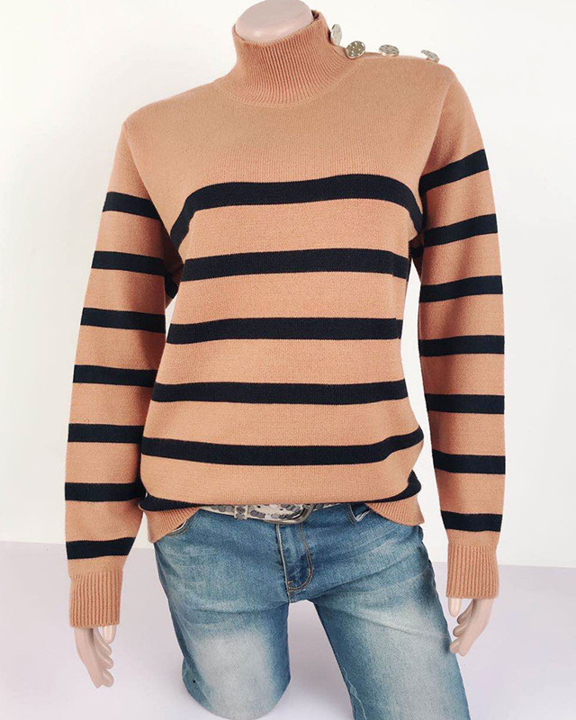 ハイネック ボーダーニット レディース ニット セーター ハイネックニット ニットトップス ボーダー柄 肩ボタン付き おしゃれ 春 秋 冬