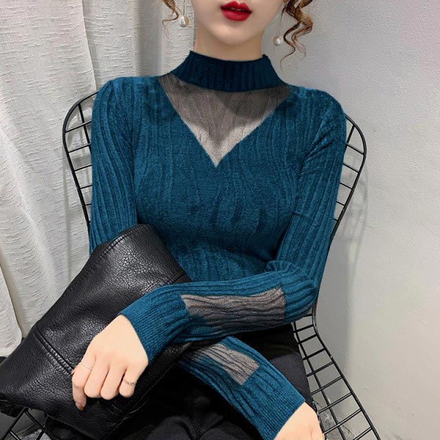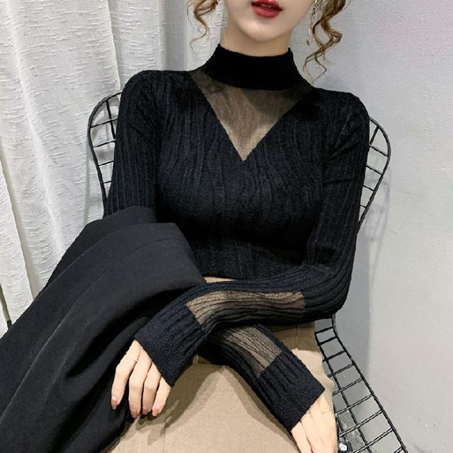 チュールレース ニットトップス レディース ハイネックニット ニット セーター 秋冬 インナー ハイネック シースルーニット フェミニン セクシー 女性