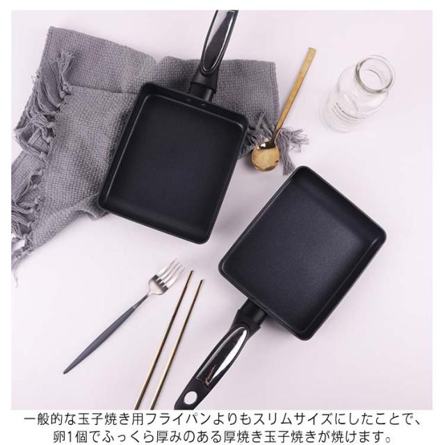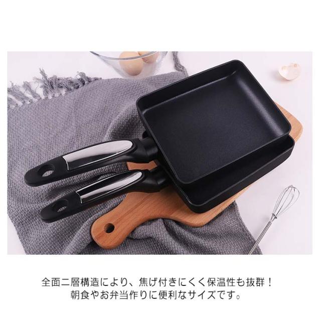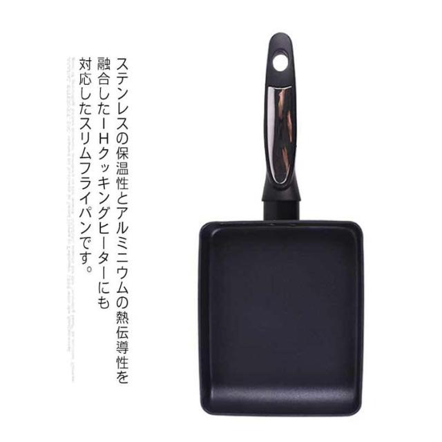 | ステンレスの保温性とアルミニウムの熱伝導性を融合したIHクッキングヒーターにも対応したスリムフライパンです。 全面二層構造により、焦げ付きにくく保温性も抜群!朝食やお弁当作りに便利なサイズです。 一般的な玉子焼き用フライパンよりもスリムサイズにしたことで、卵1個でふっくら厚みのある厚焼き玉子焼きが焼けます。 金属ヘラ対応!菜箸ではうまく玉子焼きがひっくり返せない…そんな方も安心してお使い頂けます。 熱伝導及びガス火の熱源を効率よく伝達できるから、美味しい調理が可能となります。 玉子焼きだけでなく、お弁当用のおかずを焼いたり、魚の切り身などのちょっとした物を焼くのにも便利です! | |