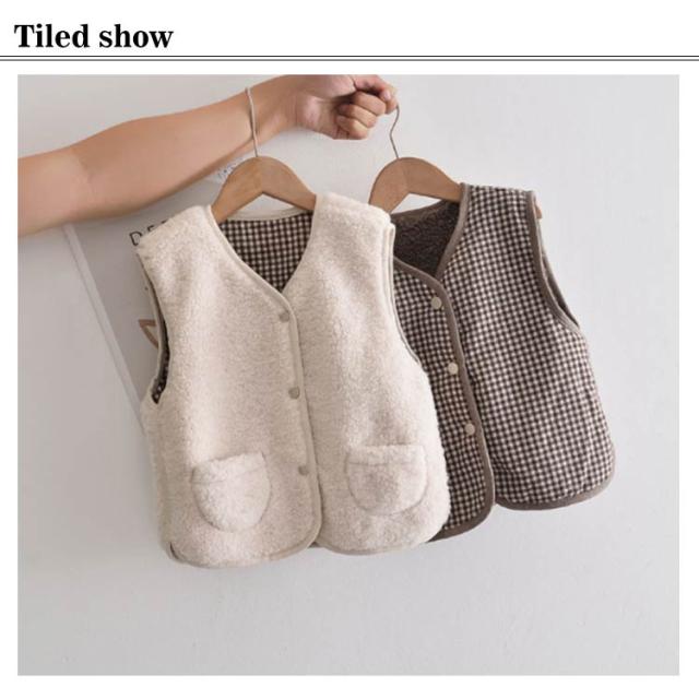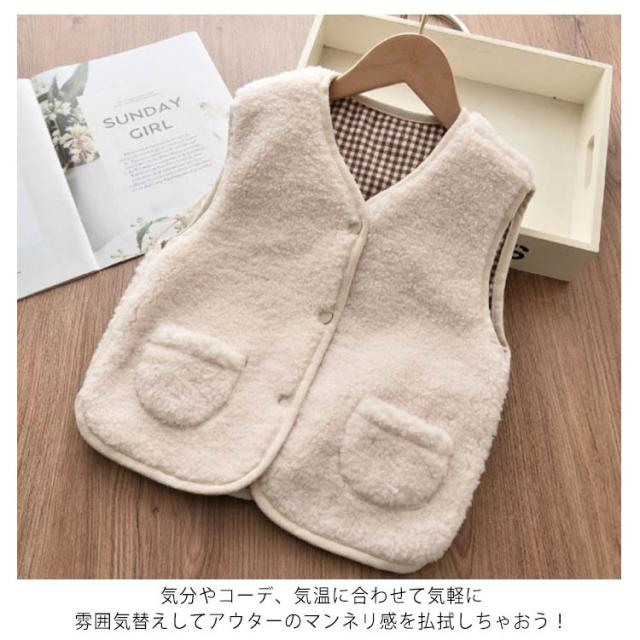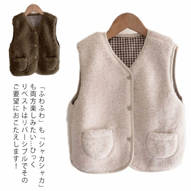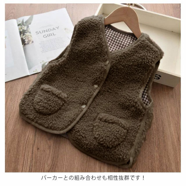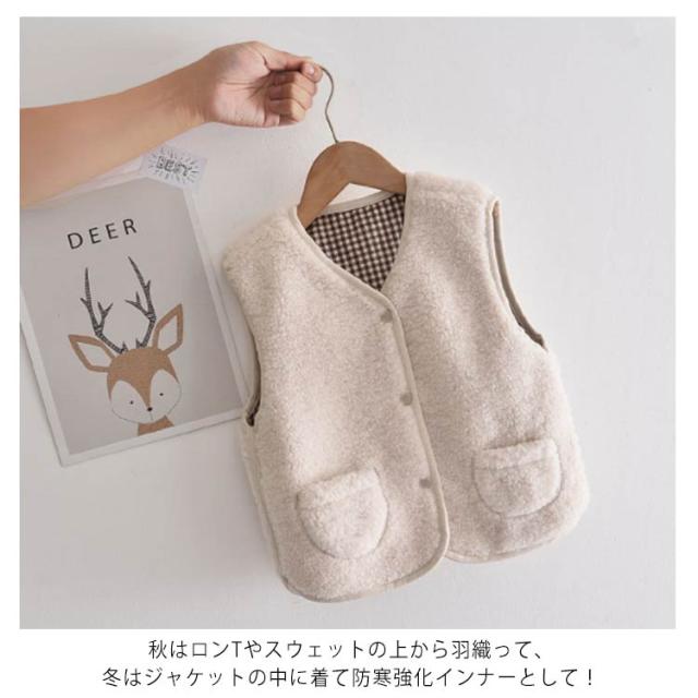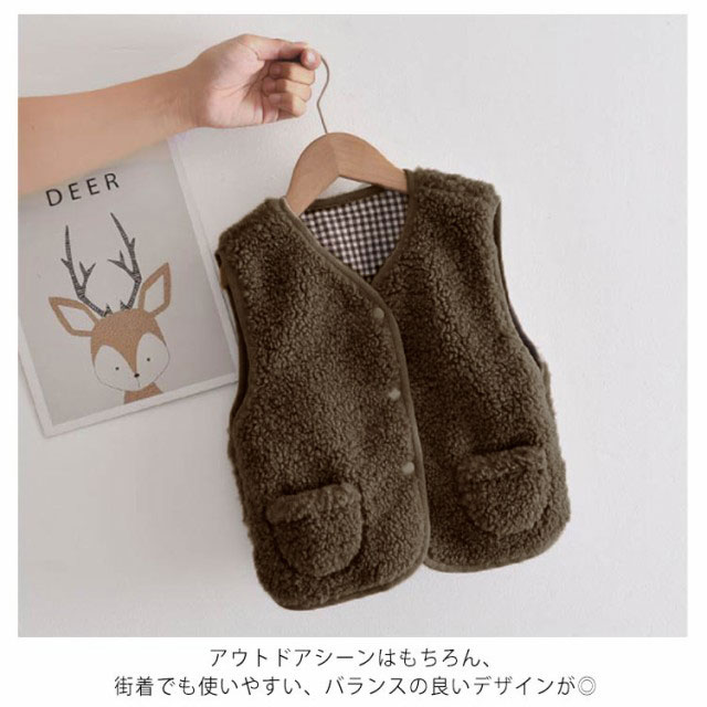【送料無料】ボアベスト キッズ リバーシブル 浅Vネック 前開き あったか 子供 子ども 男の子 女の子 アウター ジャケット 羽織り 春 秋 冬 モコモコ 裏起毛 ポケット付き フードなし カジュアル ナチュラル 温かい 暖かい 90 100~140