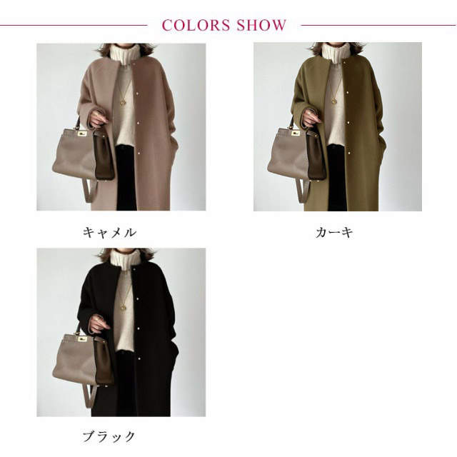 | カジュアルにもフォーマルにも使えるノーカラーコート。 どんな服装にも合わせやすいシンプルなデザイン、スッキリしたシルエットに仕上げました。 肌触りのよい素材、とてもソフトで心地良い生地に仕上がっています。 ボディーラインを拾わないのでウエストや腰回りを自然にカバーできます。 首周りがスッキリしたノーカラーデザイン、レイヤードスタイルなど着まわしも楽しんで頂けるデザイン。 | |