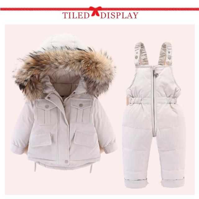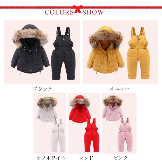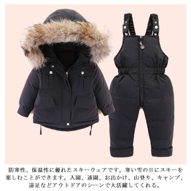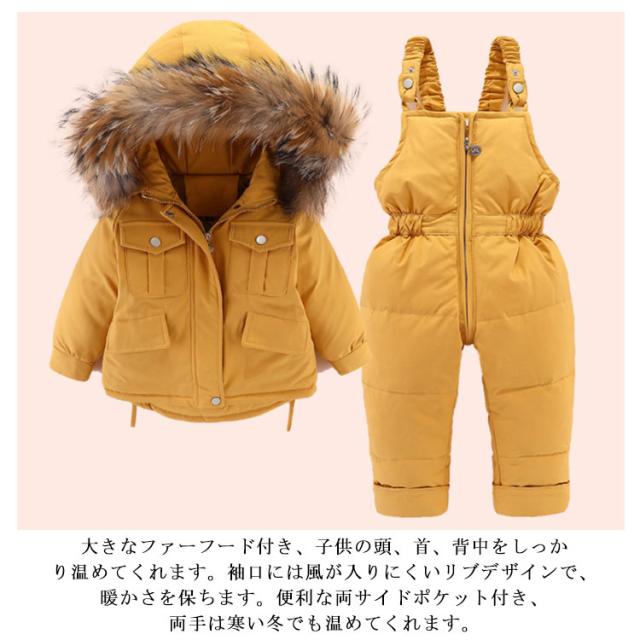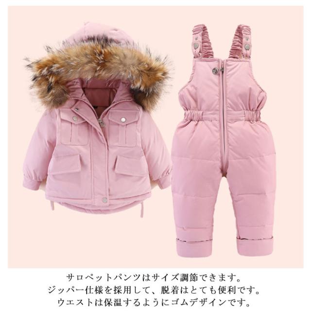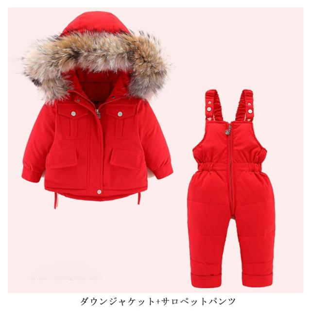 ダウン90% キッズ ダウンジャケット 2点セット ダウンコート+ダウンサロペット ベビー服 上下セット 女の子 男の子 無地 フード付き 子供服 アウター ラクーンファー付き アウトドア キッズジャケット 雪遊び 防寒 お出かけ 防寒 冬