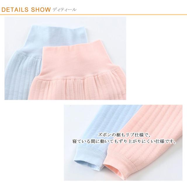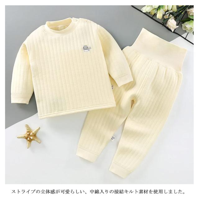 | お家での快適なリラックスタイムを過ごすのに最適なベビー用パジャマが登場。 ストライプの立体感が可愛らしい、中綿入りの接結キルト素材を使用しました。 柔らかく肌触りの良いコットン素材を採用し、着心地にこだわったセットアップルームウェア。 優しいフィット感のハラマキ付きでお子様を冷えからしっかりと守ります。 ズボンの裾もリブ仕様で、寝ている間に動いてもずり上がりにくい仕様です。 洗練されたシンプルなデザインは、パジャマとしてはもちろん、トップスのみ、ボトムのみでも、お手持ちのアイテムと合わせて着用いただけます。暖かくて快適なお家時間や睡眠をサポートします。 | |