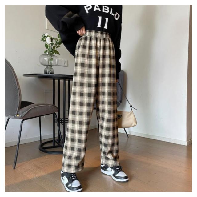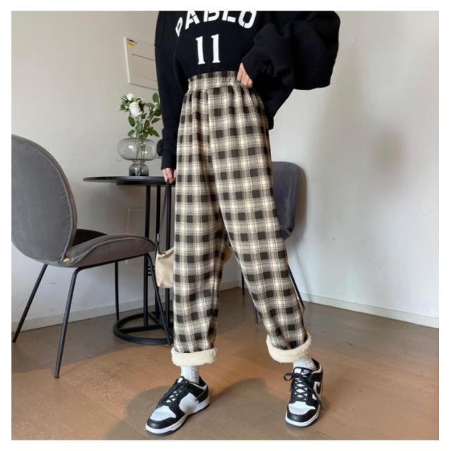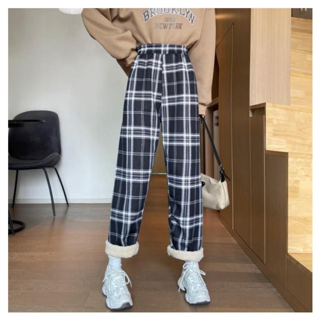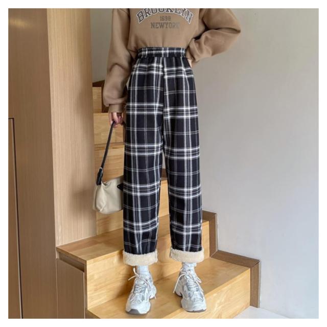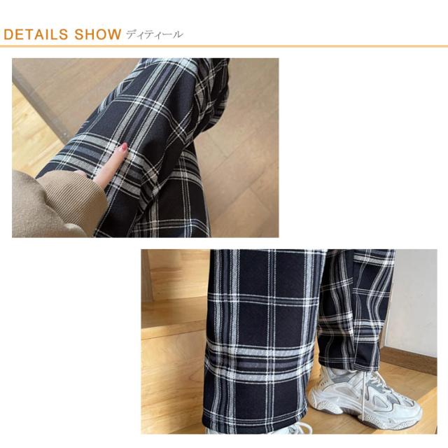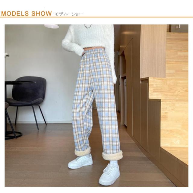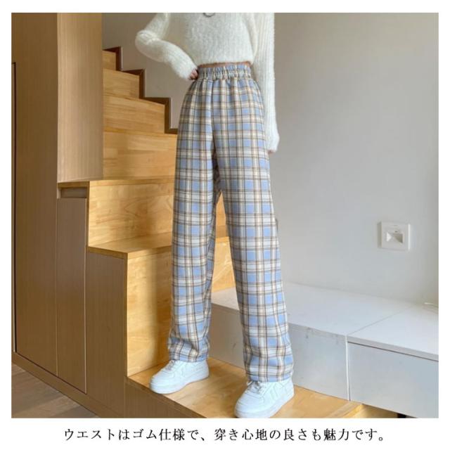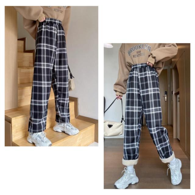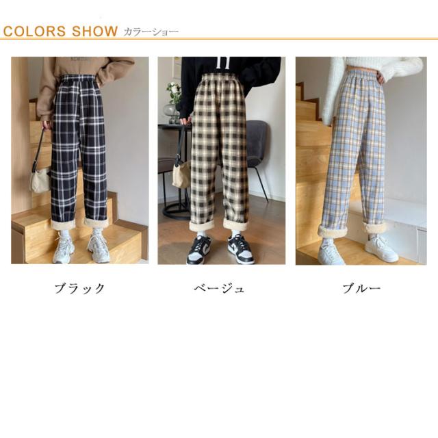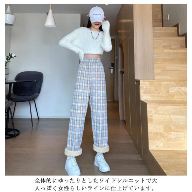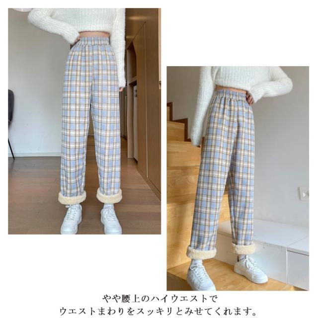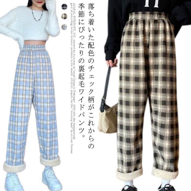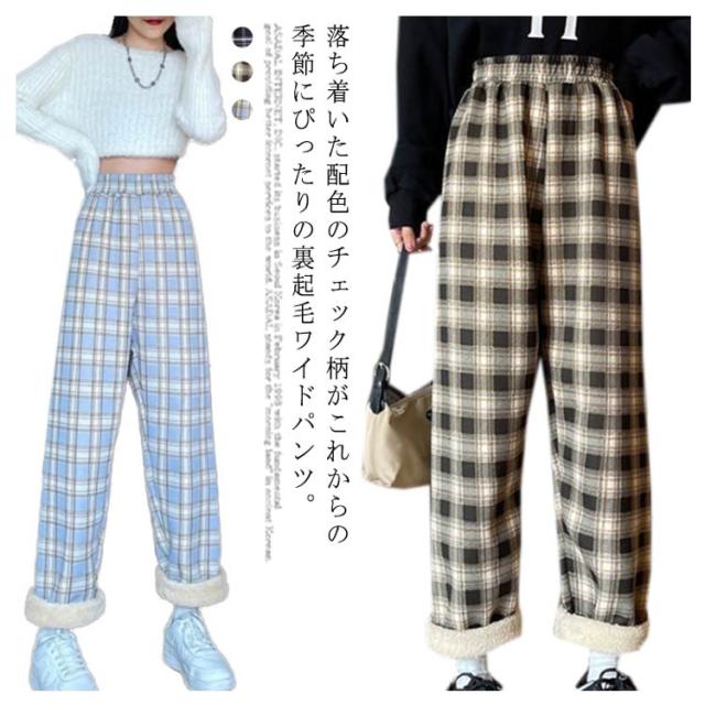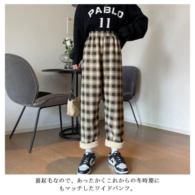 ワイドパンツ 裏起毛 レディース ウエストゴム ストレートパンツ チェック柄 ボトムス 長ズボン ロング ラフ 厚手 大きいサイズ 秋冬 ハイウエスト あったか 裏ボア 防寒 10分丈 S/M/L/2L/3L ブラック ベージュ