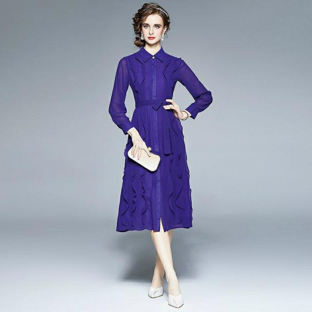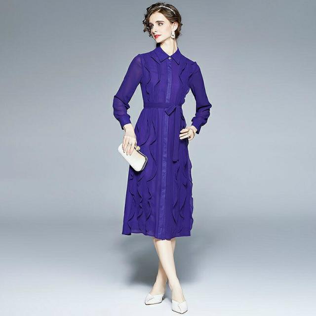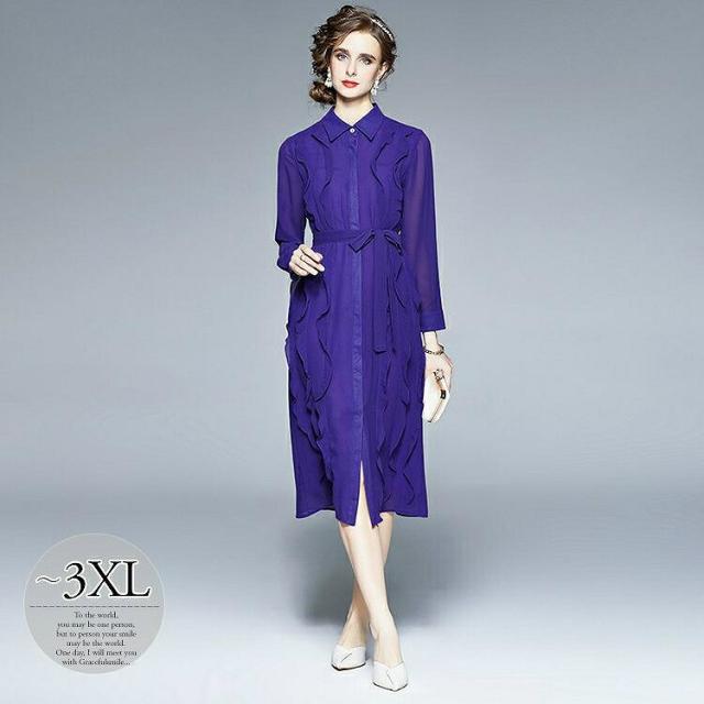ワンピース 襟付き 透け感 フリル ウエストリボン 袖ボタン 無地 ボタン リゾート ママスタイル キレイ目 かわいい 大人可愛い フェミニン 清楚 食事会