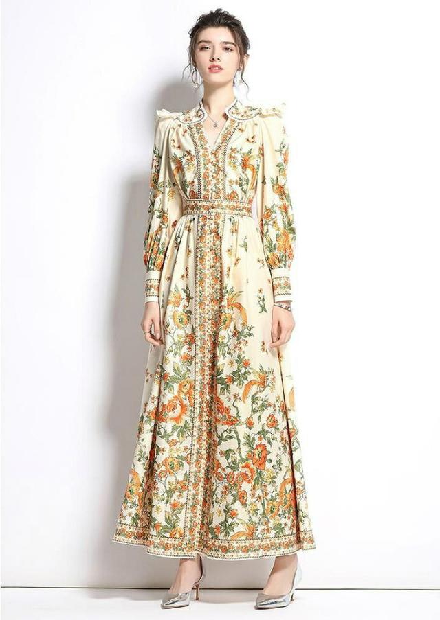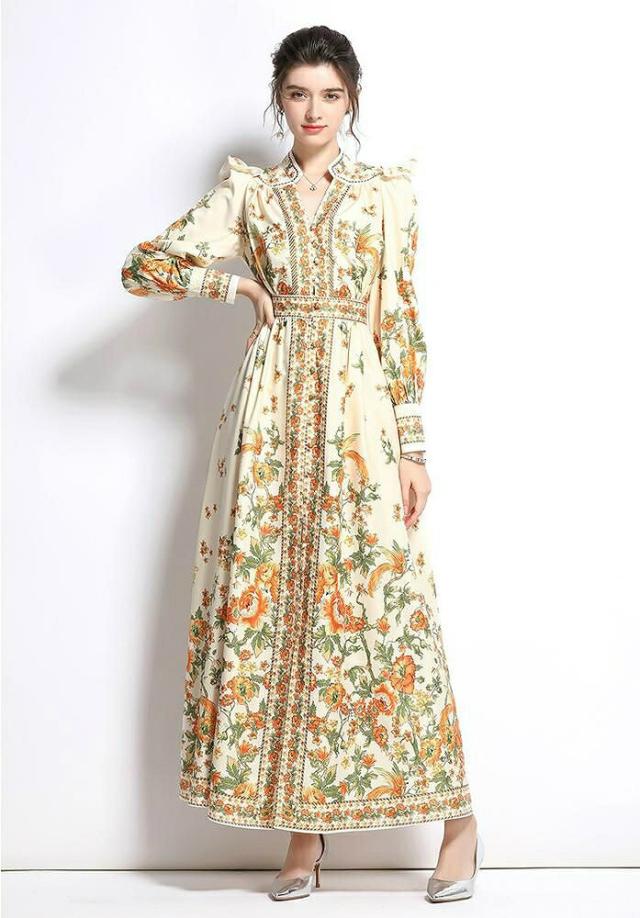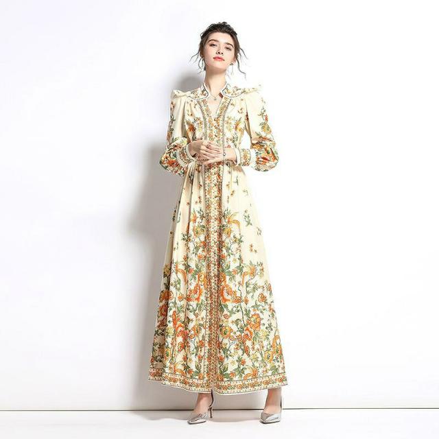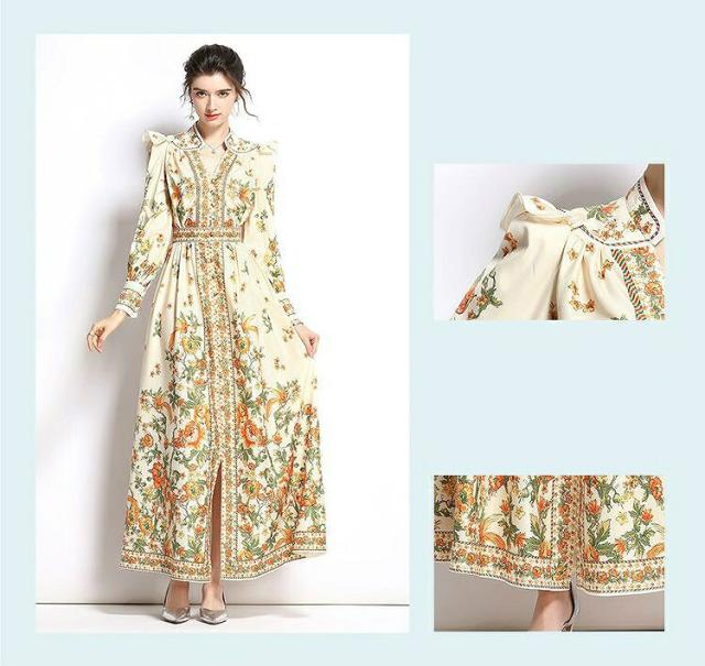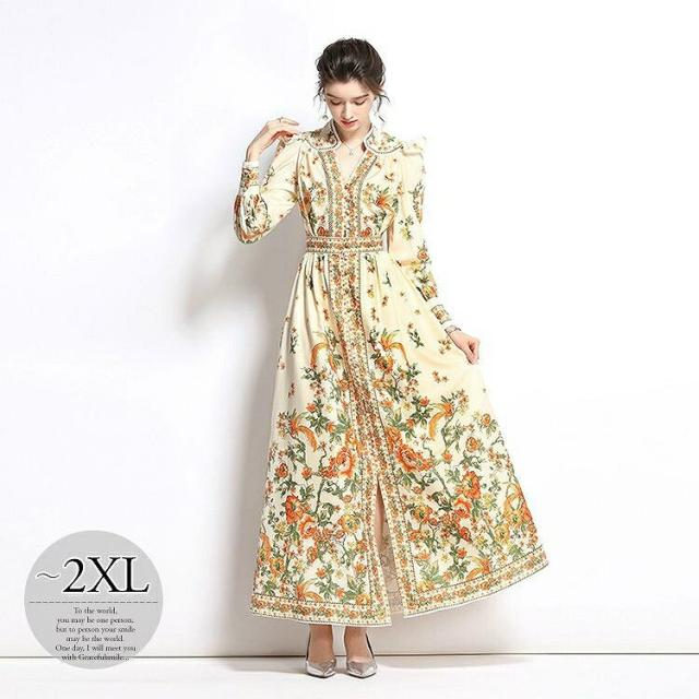 ワンピース 花柄 フリル ウエストマーク 総柄プリント ロング丈 クラシカル 可愛い ママ フェミニン 食事会 定番 ガーリー 女子会 デート 大人可愛い