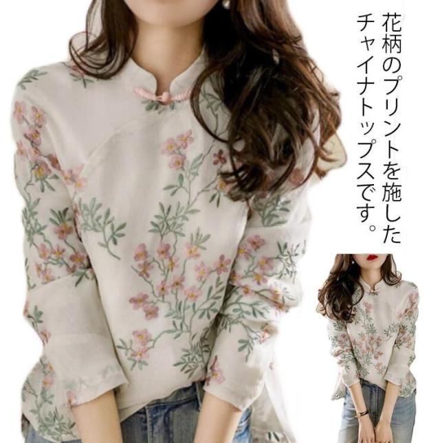 ブラウス チャイナ風 レディース 長袖 リネンブラウス 綿麻 麻混 チャイナトップス 総柄 花柄 プリント リネン混 シャツ スタンドカラー プルオーバー チャイナボタン ゆったり 薄手 ナカジュアル 送料無料