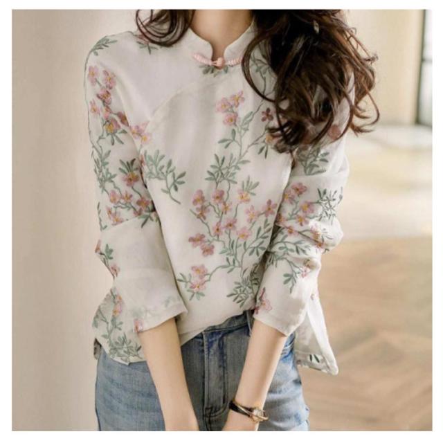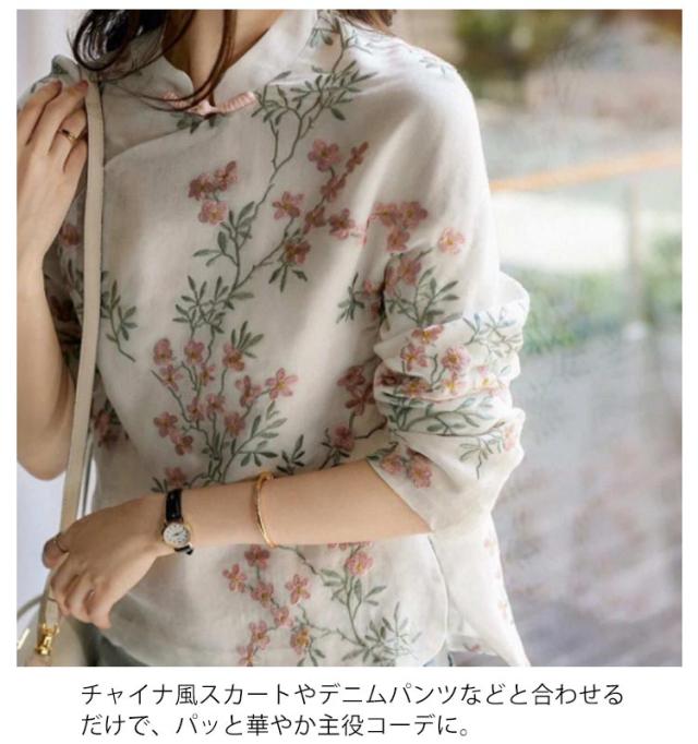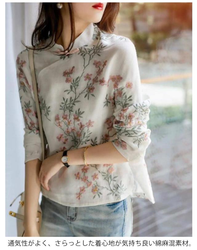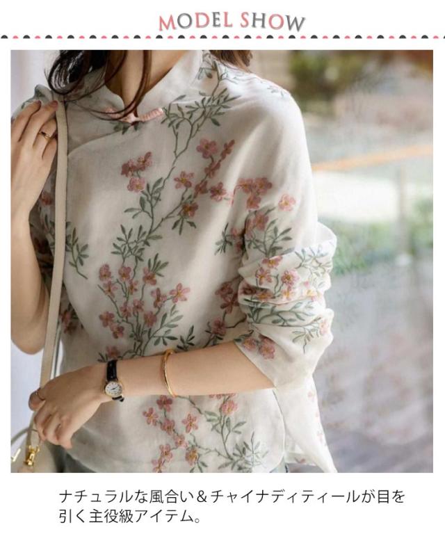 | 花柄の刺繍を施したチャイナトップスです。 ナチュラルな風合い&チャイナディティールが目を引く主役級アイテム。 通気性がよく、さらっとした着心地が気持ち良い綿麻混素材。 チャイナ風スカートやデニムパンツなどと合わせるだけで、パッと華やか主役コーデに。 | |