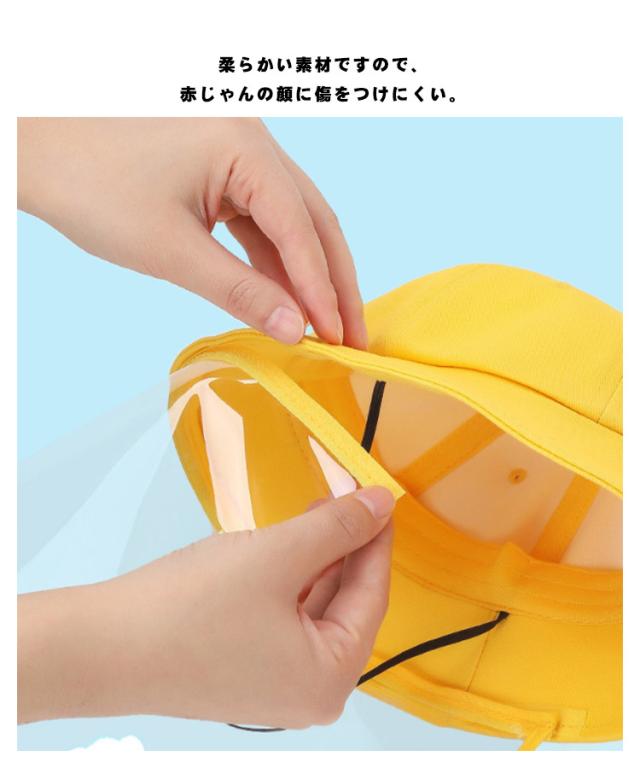 | 花粉症やウイルス対策におススメ。 透明なシールドが顔を外部接触から隔離し、厄介な花粉やウイルスの飛沫感染を予防します。 柔らかい素材ですので、赤じゃんの顔に傷をつけにくい。 ファスナーでシールドを外すことができるので、普通のハットとしてもお使いいただけます。 透明フェースカバー部分、水で洗い可能、アルコールで消毒でもオーケー! コンパクトに畳める柔らか素材なので、バックに入れて持ち歩くことも可能です。 | |