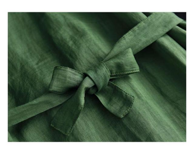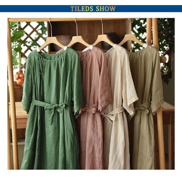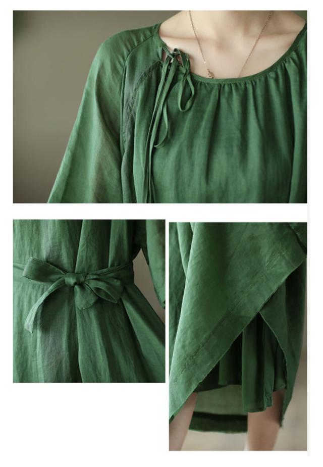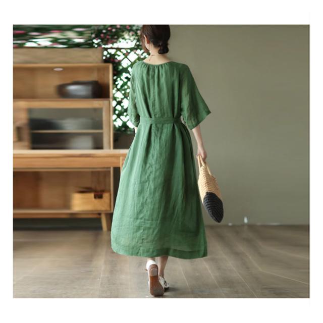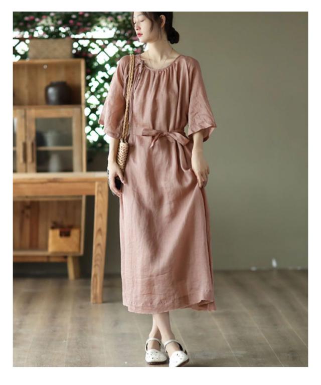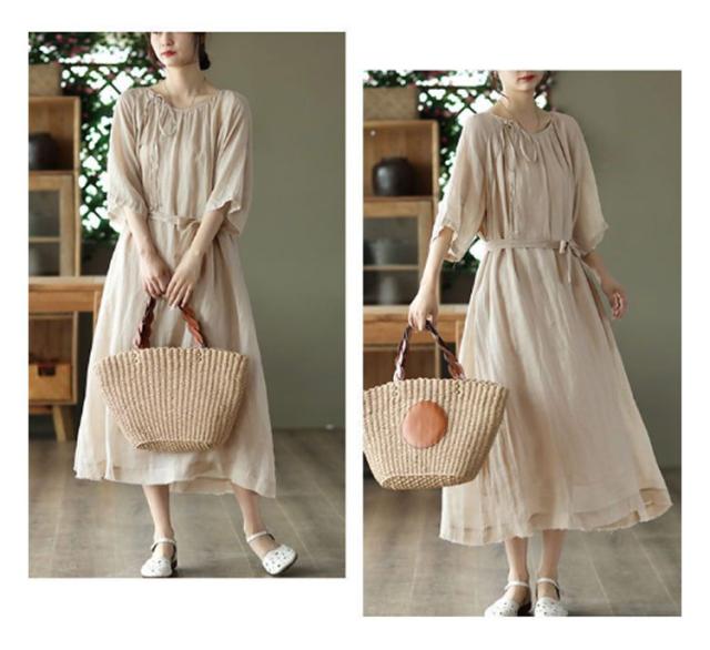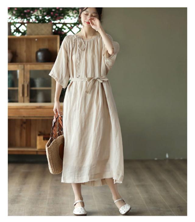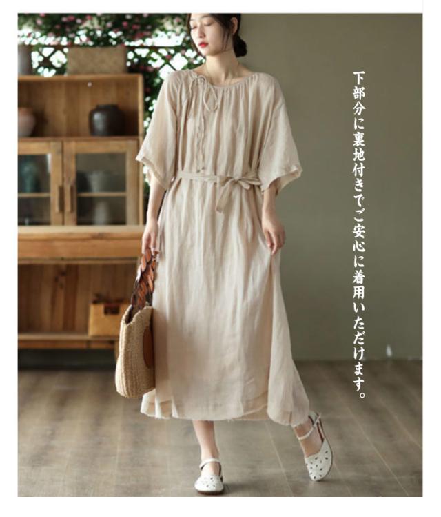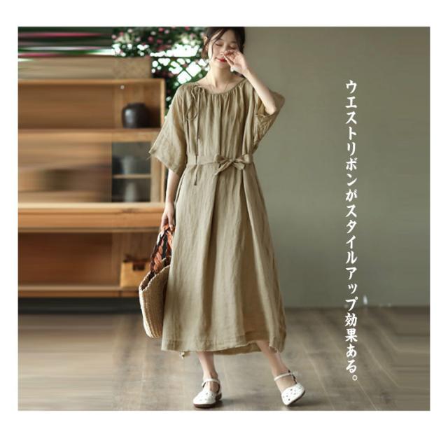 | シンプルで飽きのこないデザインのワンピース。 コットン素材で良い着心地。 ウエストリボンがスタイルアップ効果ある。 ゆったりで体型カバーが叶います。 下部分に裏地付きでご安心に着用いただけます。 | |