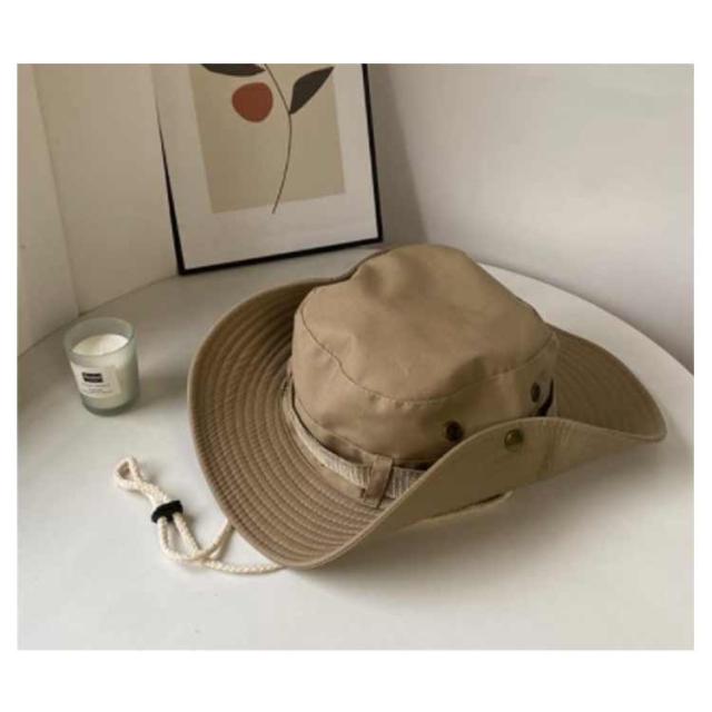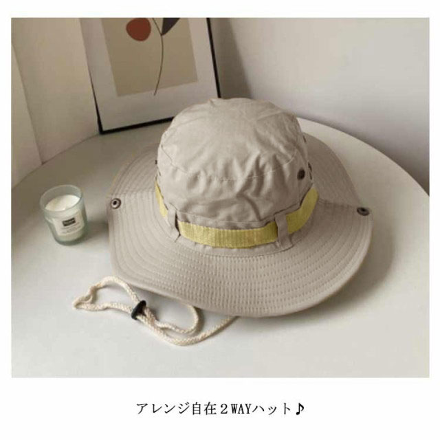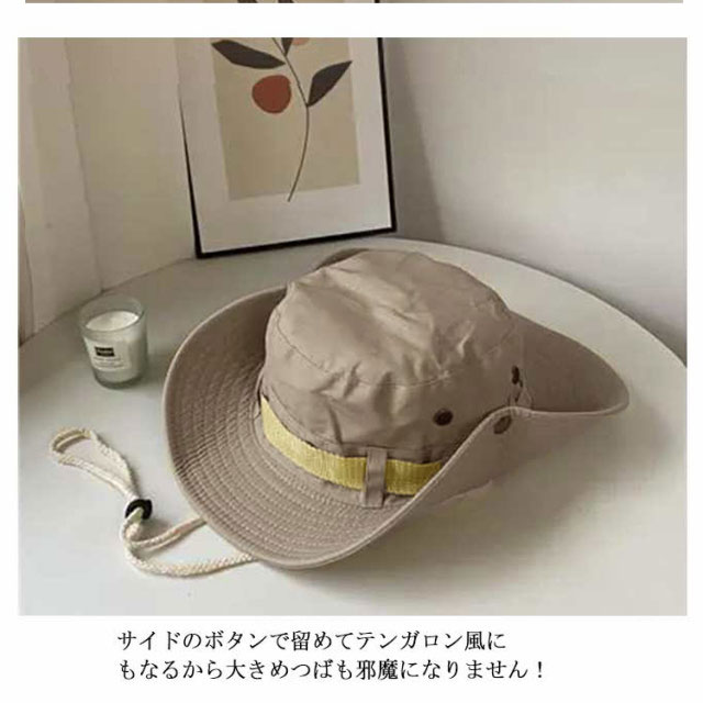 | 春から秋まで長く使える、おでかけに大活躍のサファリハット。 普段使いやレジャーでも! ひも付きだから自転車でも風で飛ばない、女性らしく見せるつばのデザインでUV対策もOK! アレンジ自在2WAYハット♪ サイドのボタンで留めてテンガロン風にもなるから大きめつばも邪魔になりません! エレガントにも、カジュアルにも幅広く合わせられるシンプルなデザインも魅力です。 | |