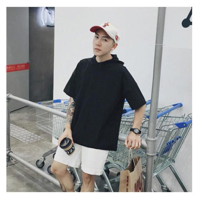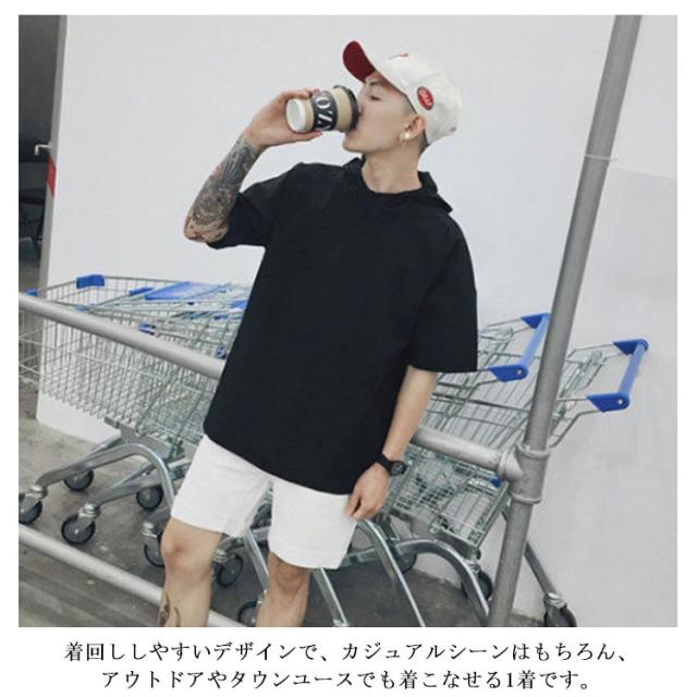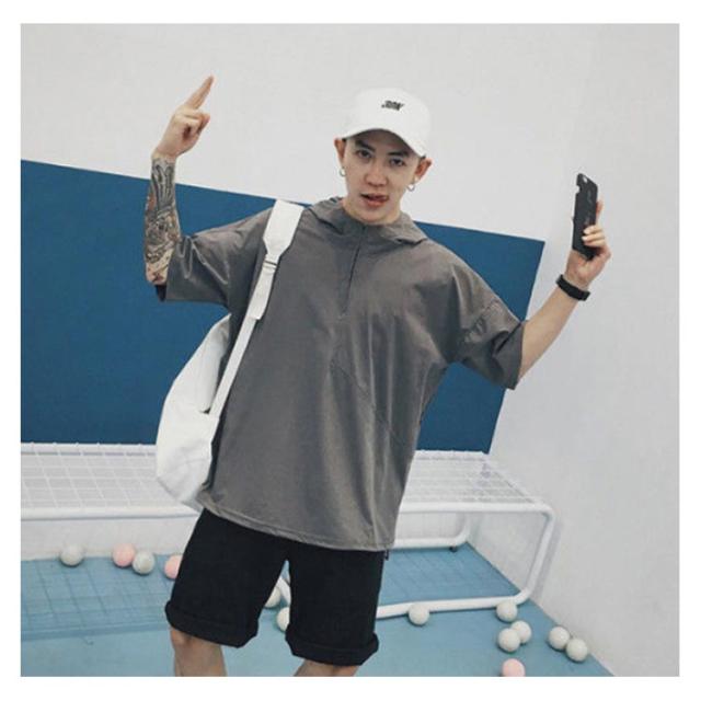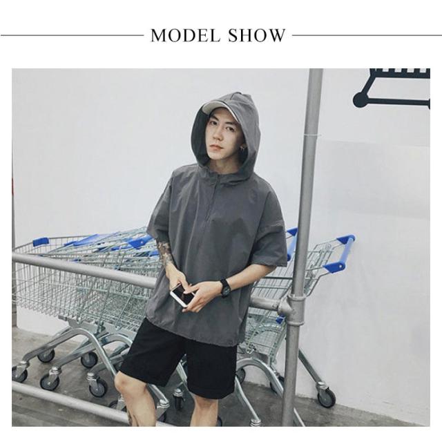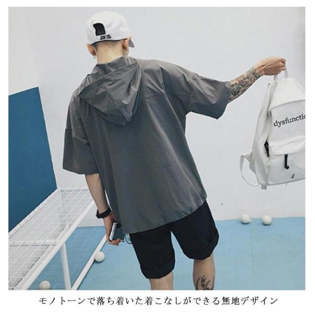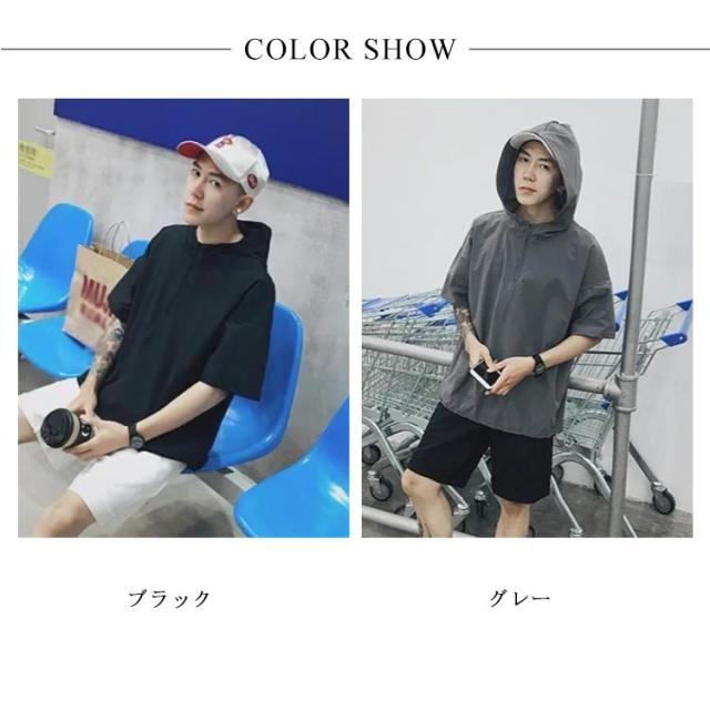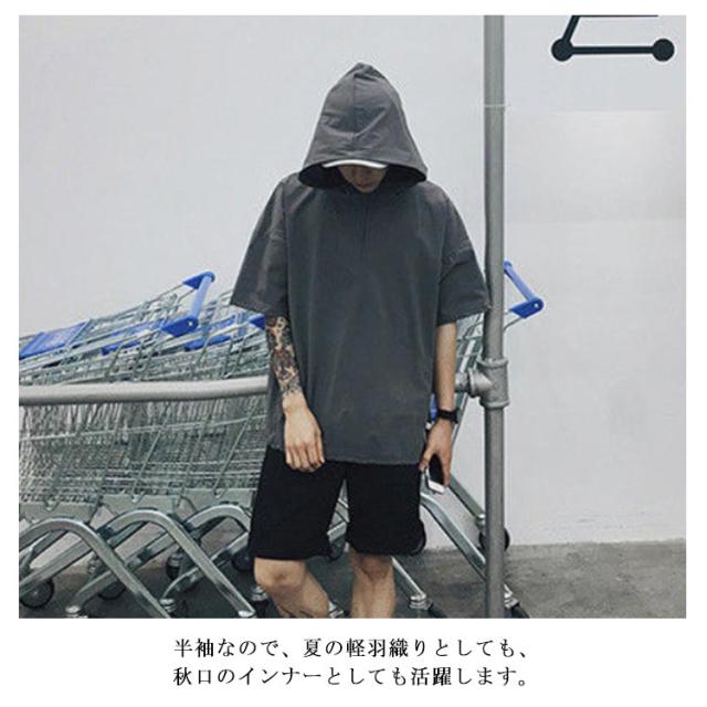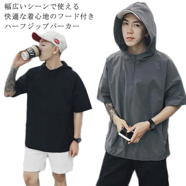 薄手 【送料無料】半袖パーカー フード付き パーカー レイヤード スッキリ 春夏秋 五分袖 ハーフジップ 速乾 ジャケット メンズ 通学 通勤 スリム ストリート カジュアル 重ね着 大きいサイズ プルオーバー