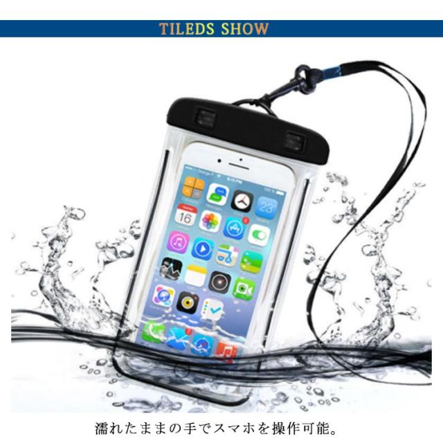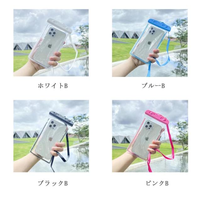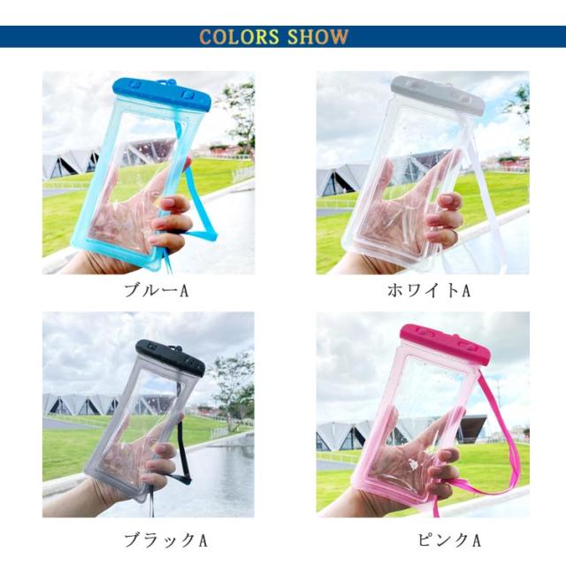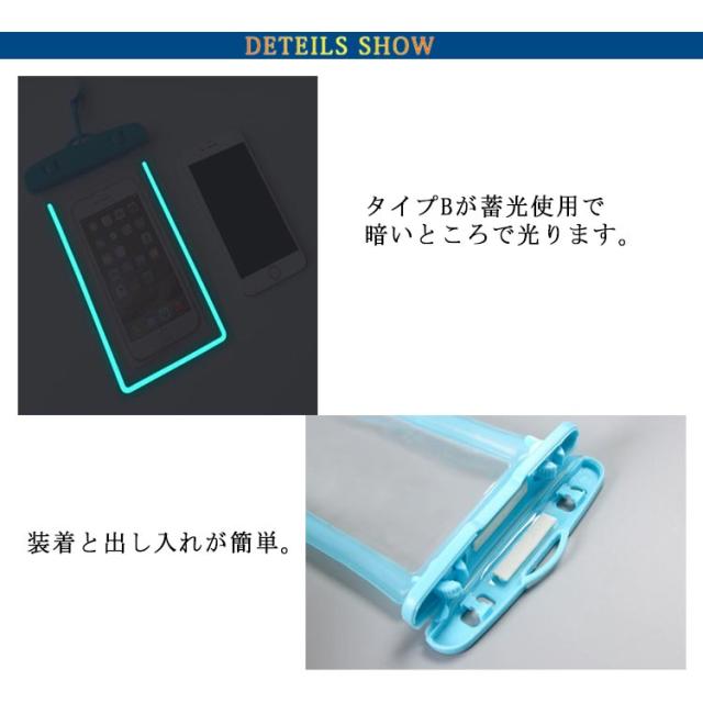 | 濡れたままの手でスマホを操作可能。 ネックストラップで首かけすることが可能。 装着と出し入れが簡単。 透明度が高く、水中での撮影やビデオ鑑賞にも最適。 タイプBが蓄光使用で暗いところで光ります。 | |