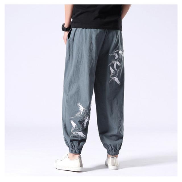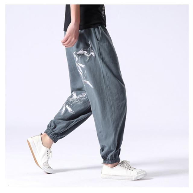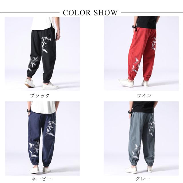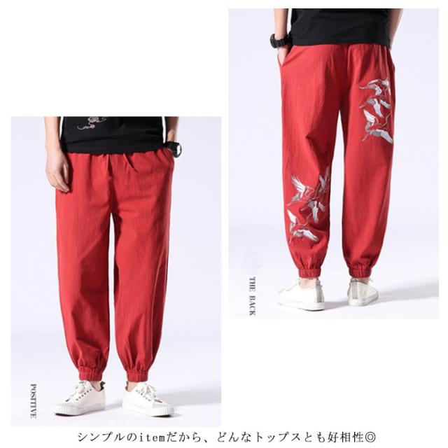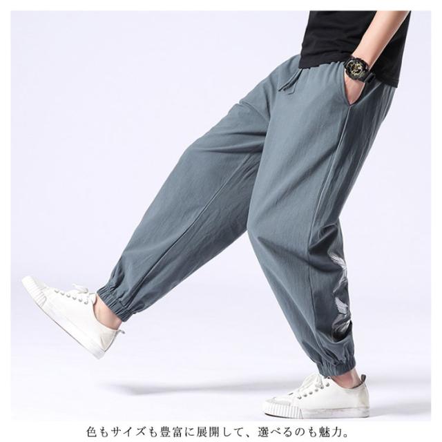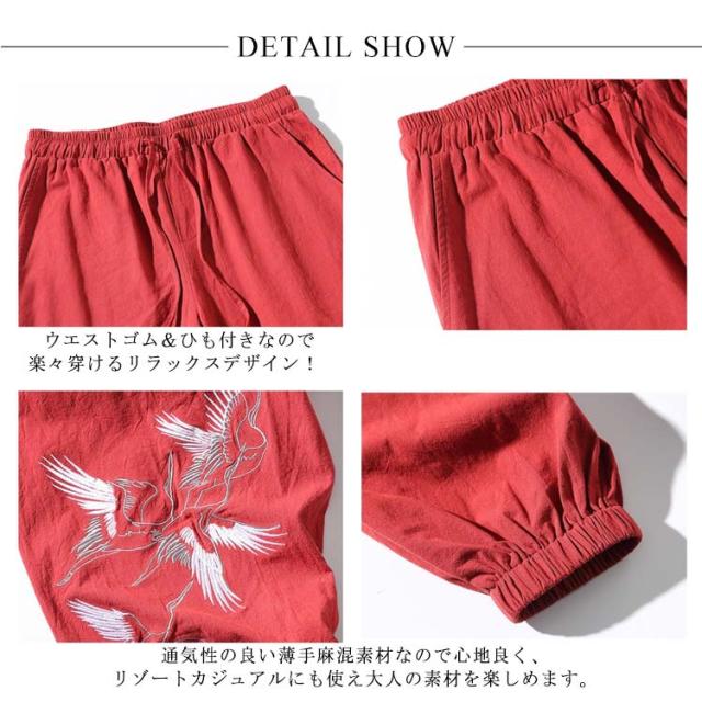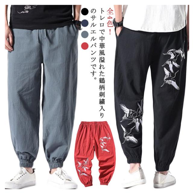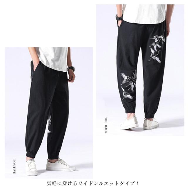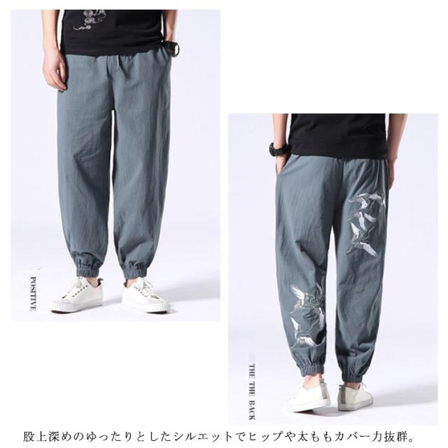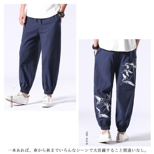 イージーパンツ メンズ リネン 鶴柄刺繍パンツ 送料無料 ジョガーパンツ ボトムス カジュアルパンツ 長ズボン 綿麻 ワイド サルエルパンツ サルエル 大きサイズ 鶴刺繍 麻 刺入り リラックス 春 リネン