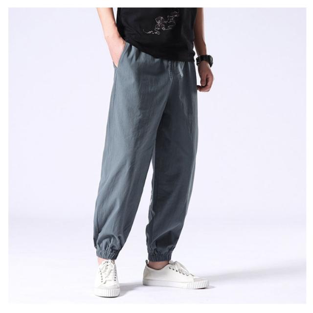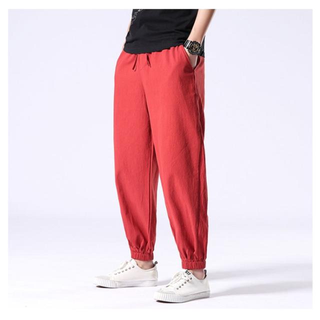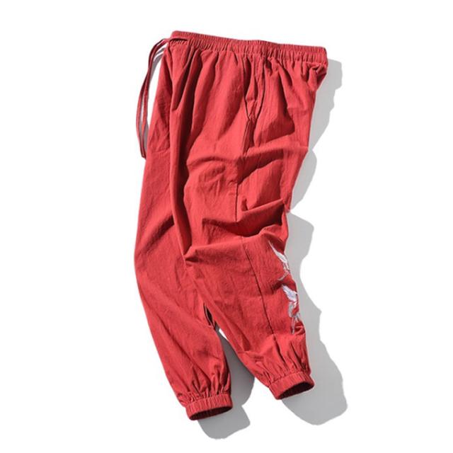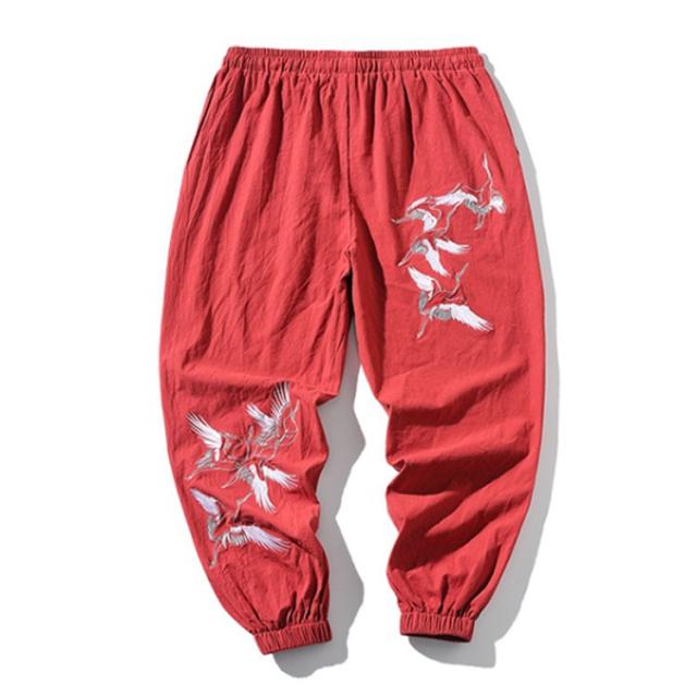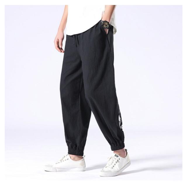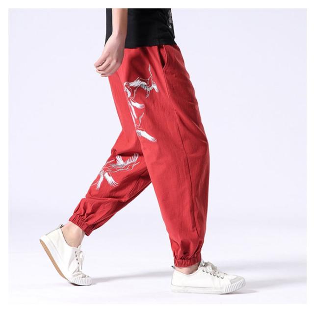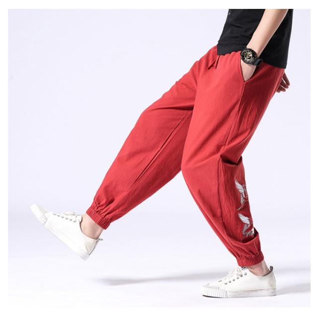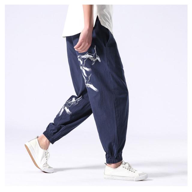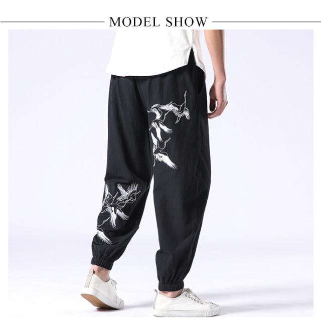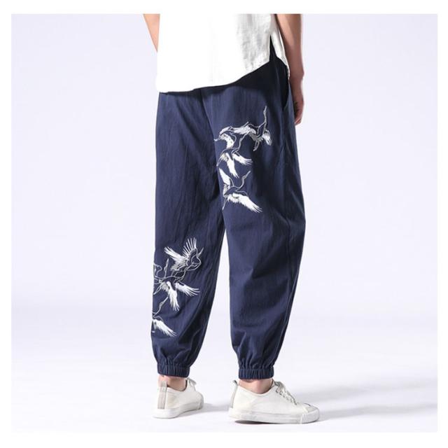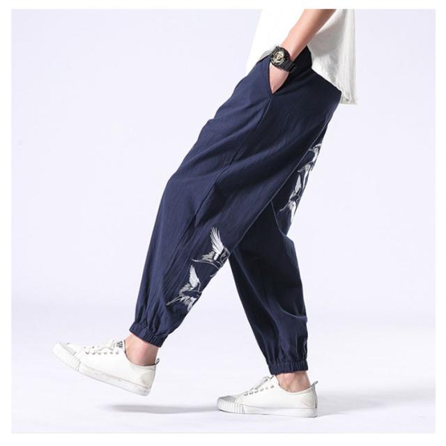 イージーパンツ メンズ リネン 鶴柄刺繍パンツ 送料無料 ジョガーパンツ ボトムス カジュアルパンツ 長ズボン 綿麻 ワイド サルエルパンツ サルエル 大きサイズ 鶴刺繍 麻 刺入り リラックス 春 リネン