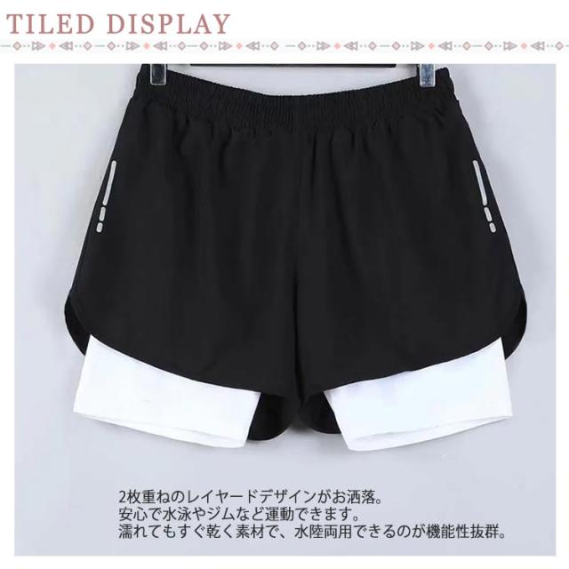 | 気になるところをカバーしてくれるタイツ付きショートパンツ。 2枚重ねのレイヤードデザインがお洒落。安心で水泳やジムなど運動できます。 濡れてもすぐ乾く素材で、水陸両用できるのが機能性抜群。 伸縮性通気性が高く、さらっとした肌触りで履き心地も快適。 ランニング,ジョギング、トレーニング、スイミングなど様々なスポーツに。 | |