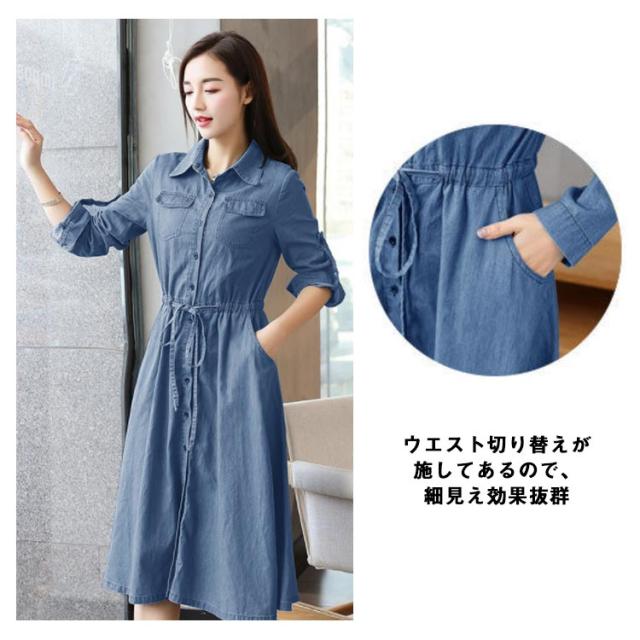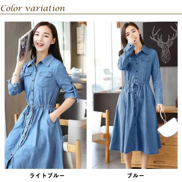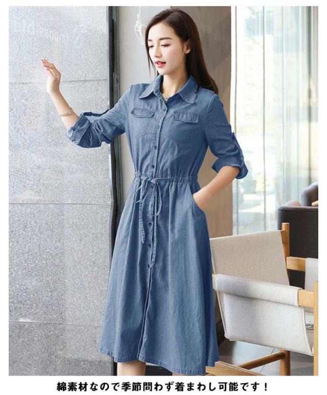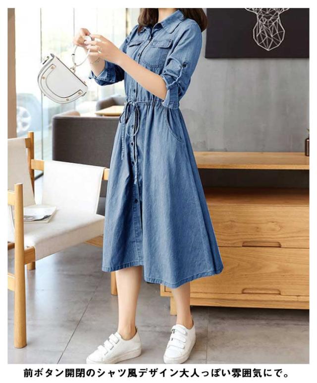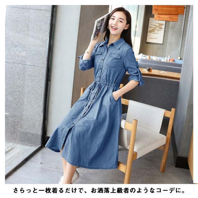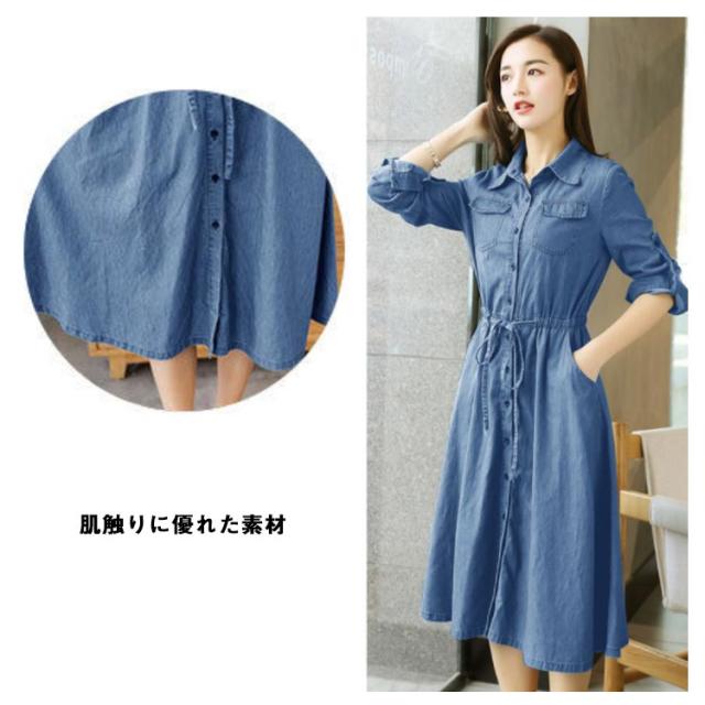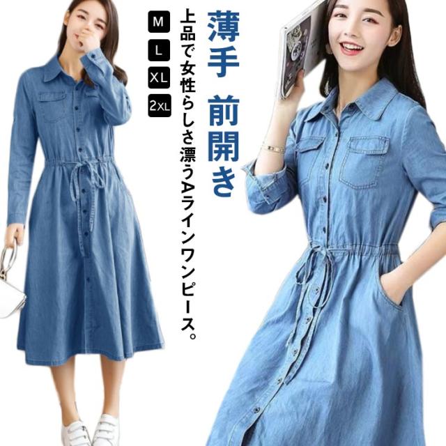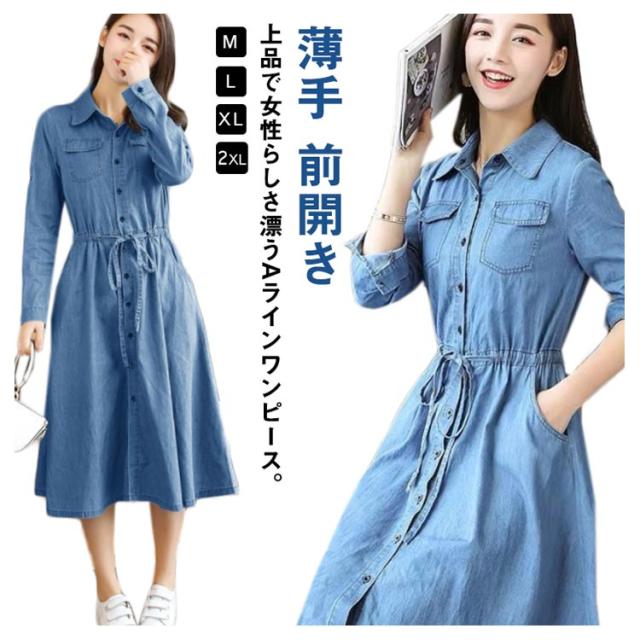 前開き 長袖 薄手 デニムワンピース 着痩せ ワンピース 夏服 秋服 お洒落 Aライン ロングワンピース 春服 綿 ミモレ丈 カジュアル 大きいサイズ レディース