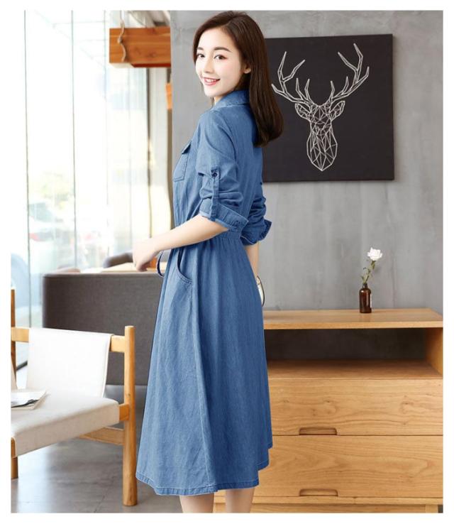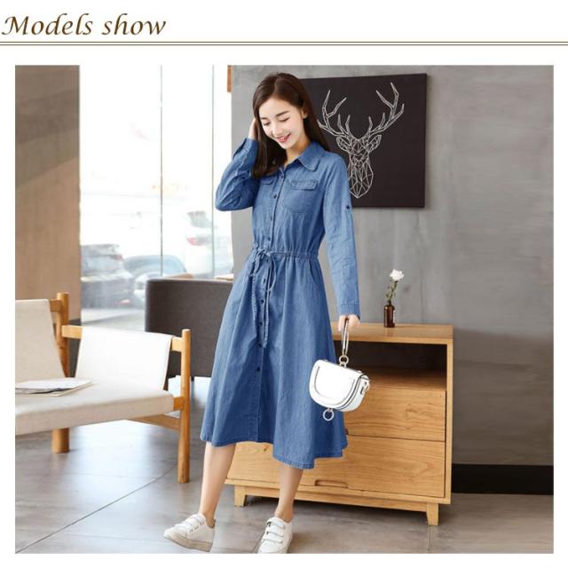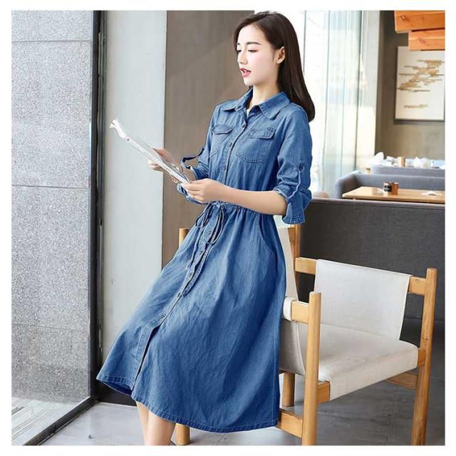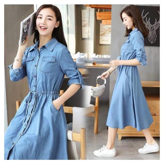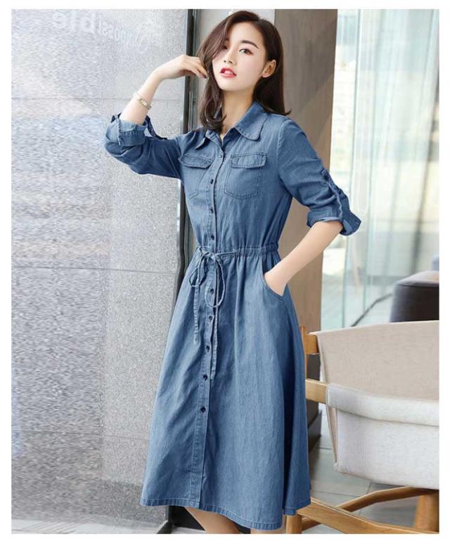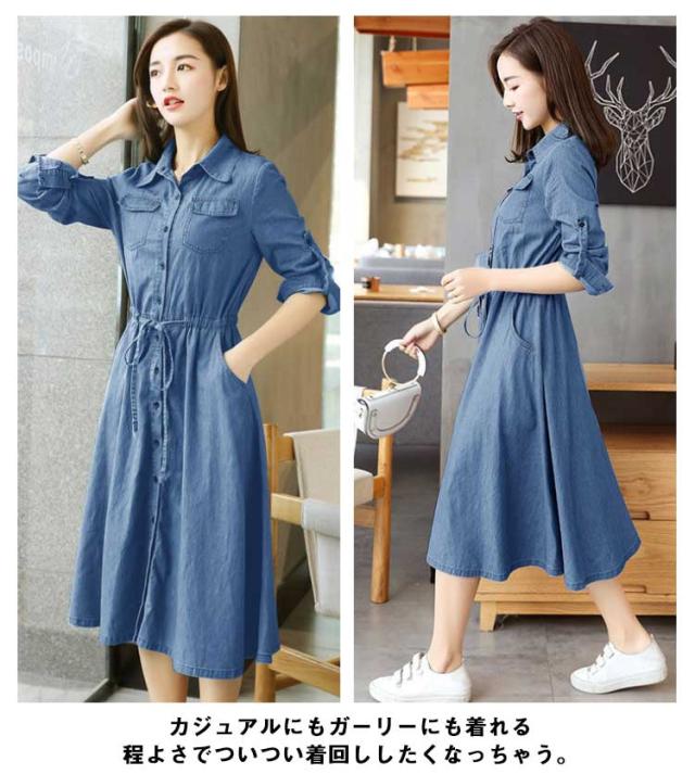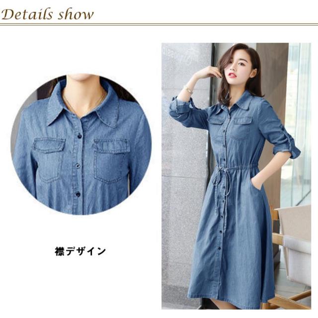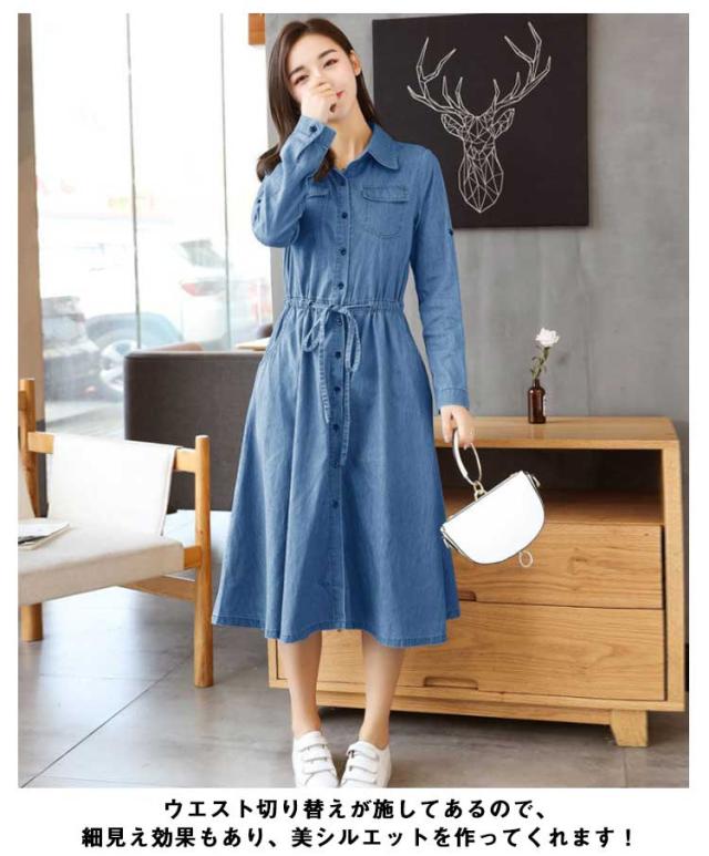 前開き 長袖 薄手 デニムワンピース 着痩せ ワンピース 夏服 秋服 お洒落 Aライン ロングワンピース 春服 綿 ミモレ丈 カジュアル 大きいサイズ レディース