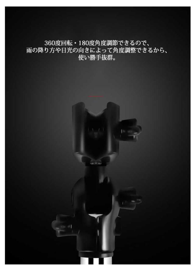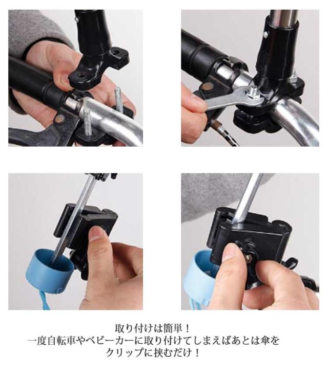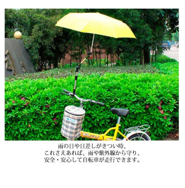 | 自転車にしっかり傘が固定できるスタンド! 雨の日や日差しがきつい時、これさえあれば、雨や紫外線から守り、安全・安心して自転車が走行できます。 スタンド本体の長さは調節でき、乗る人の身長や自転車のハンドルの高さに合わせることができます。使用しない時は下に向けたりと、自由に角度も調節可能。 360度回転・180度角度調節できるので、雨の降り方や日光の向きによって角度調整できるから、使い勝手抜群。 取り付けは簡単!一度自転車やベビーカーに取り付けてしまえばあとは傘をクリップに挟むだけ! 梅雨シーズンや日差しが強い夏時、子供の送り迎えに大活躍に間違いなしの傘スタンド。 自転車をはじめ、ベビーカー、車椅子、バイク、子供用三輪車、アウトドア椅子など幅広いものに使えます。 | |