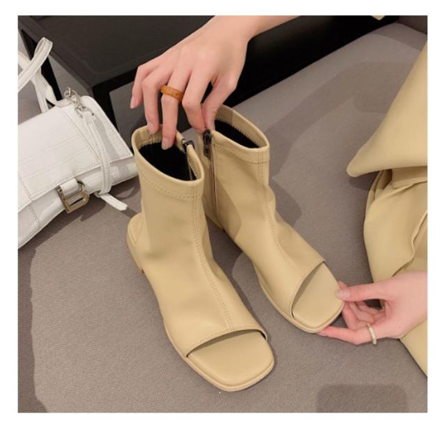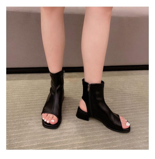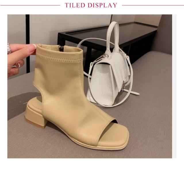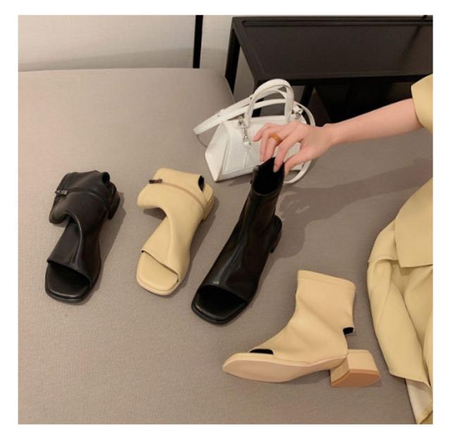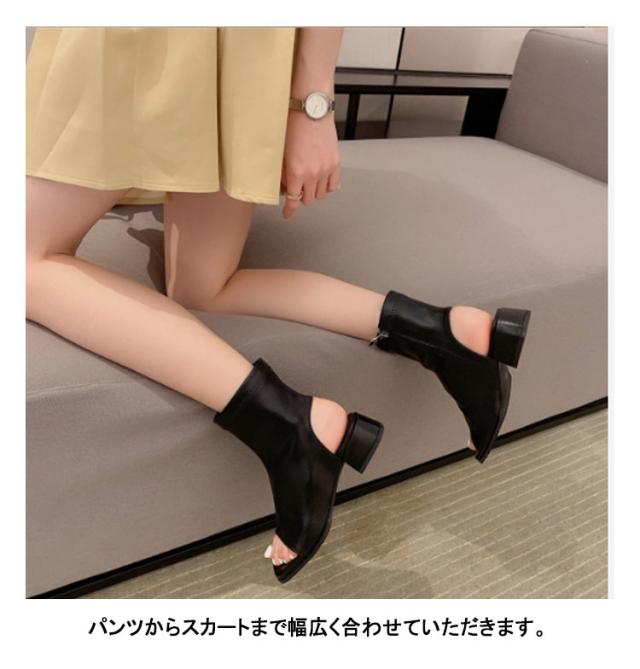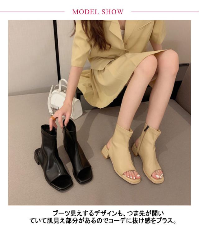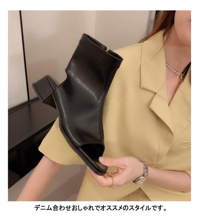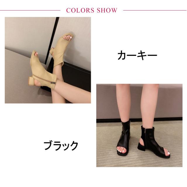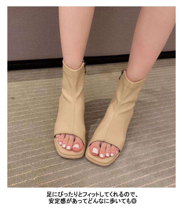 アンクル丈 太めヒール 高見え オープントゥ レディース ショートブーツ ローヒール スクエアトゥ 歩きやすい 履きやすい ブーツサンダル