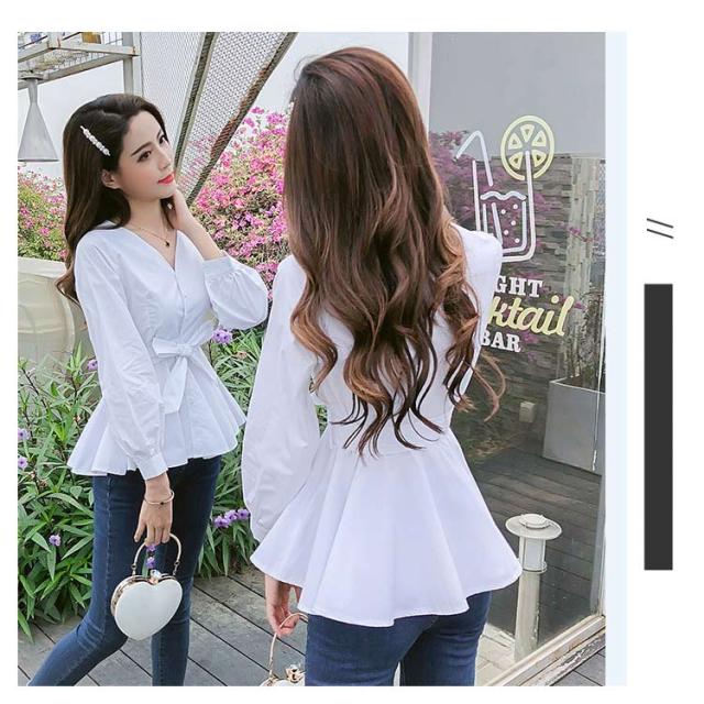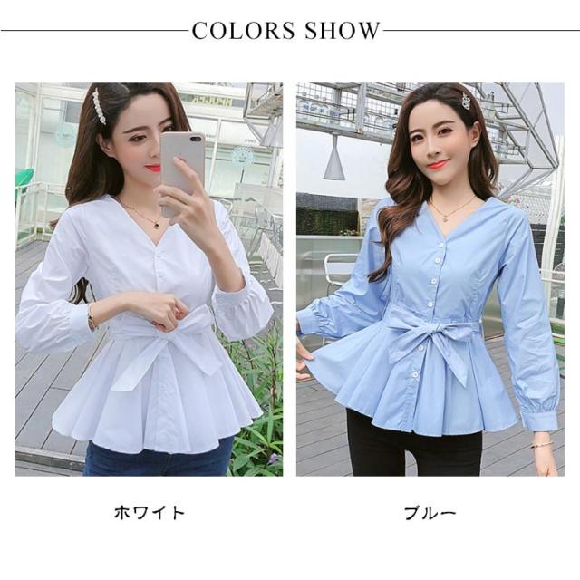レディース シャツ 長袖 ブラウス トップス Vネック 無地 フリルブラウス ウエストリボンベルト付きがアクセント!Vネックトップス Aライン フリル 秋服 春 春服 秋 リボン