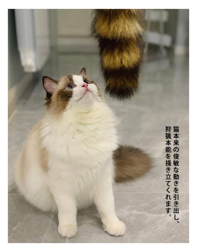 | よくしなる持ち手からしっぽがゆらゆら揺れ、それだけでも猫の興味をそそるねこじゃらし。 竿は振り出し式で約30cmから約96cmまで伸びます。 パタパタと音をさせたり、にょろにょろとヘビのように動かして遊べます。 猫本来の俊敏な動きを引き出し、狩猟本能を掻き立てくれます。 噛んでしまっても柔らかいので安心です。 | |